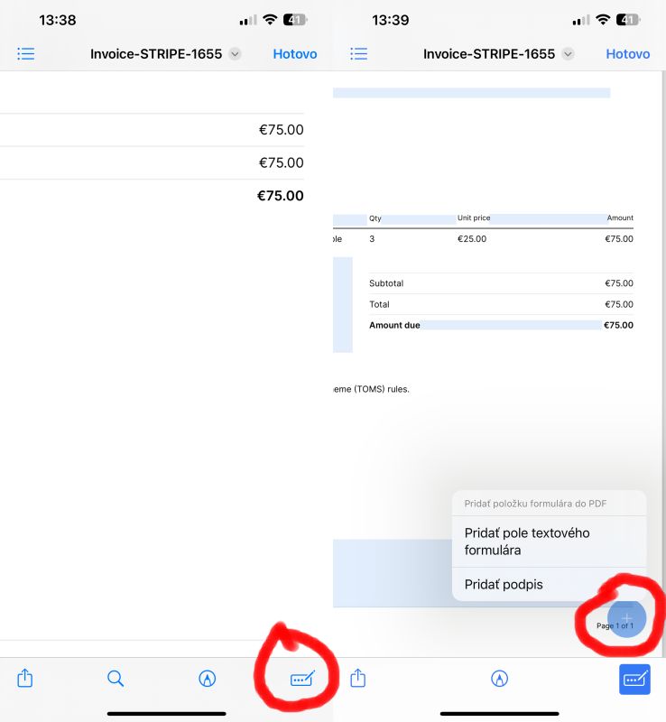 Po otvorení PDF súboru cez aplikáciu Súbory si všimnite ikonu v pravom spodnom rohu, viď. screenshoty v článku. Ťuknutím na túto ikonu aktivujete režim editácie PDF súboru. iPhone automaticky rozpozná polia, ktoré je možné vyplniť a označí ich namodro.