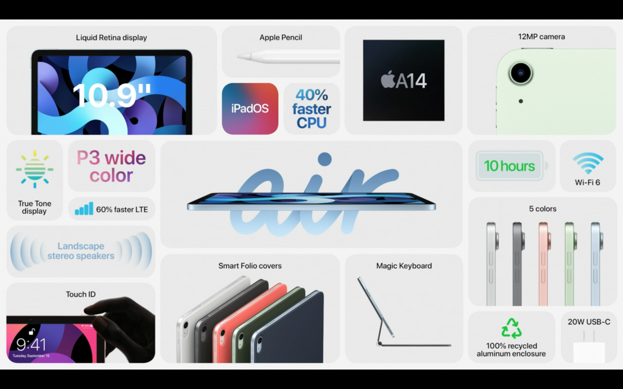 Po dizajnovej stránke nepríde k žiadnemu prekvapeniu a zariadenie sa bude podobať na svojho predchodcu. Vo výbave tak opäť nájdeme 10,9-palcový Liquid Retina displej, domovské tlačidlo s Touch ID a tenké rámiky. iPad Air bude dostupný v tradičných farebných vyhotoveniach: šedej Space Gray, striebornej Silver Green, ružovej Rose Gold a modrej Sky Blue verzii.