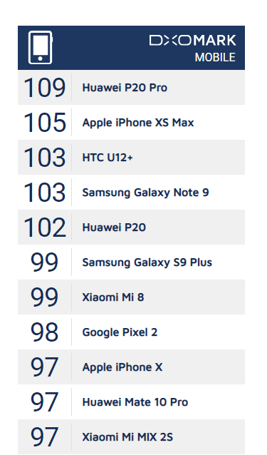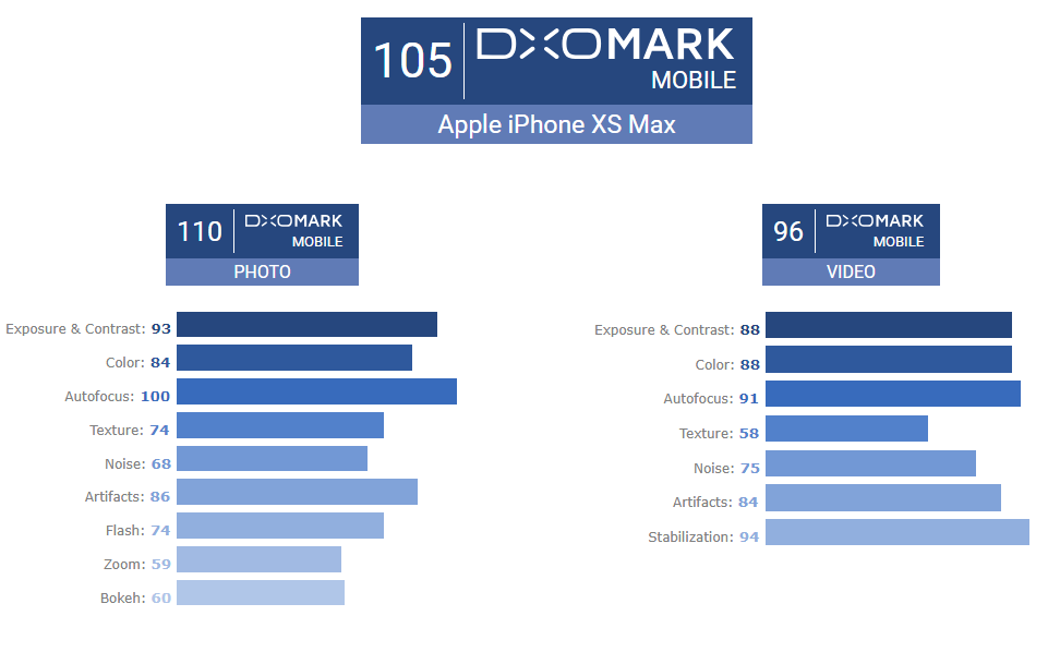 IPhone XS Max dosiahol celkové skóre 105 bodov. Kvalita fotografií a videí v dobrých svetelných podmienkach je vynikajúca, s veľmi širokým dynamickým rozsahom a dobrými detailami.