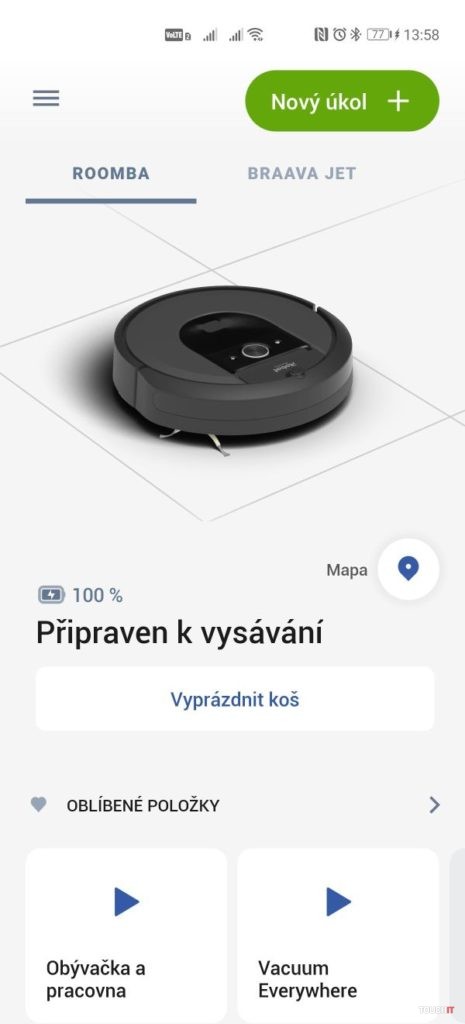 Úvodná obrazovka zobrazuje informácie o zvolenom zariadení. Môžete si skontrolovať stav batérie, mapu vašej domácnosti alebo mu zadať novú úlohu. Časté úlohy si môžete uložiť ako obľúbené položky