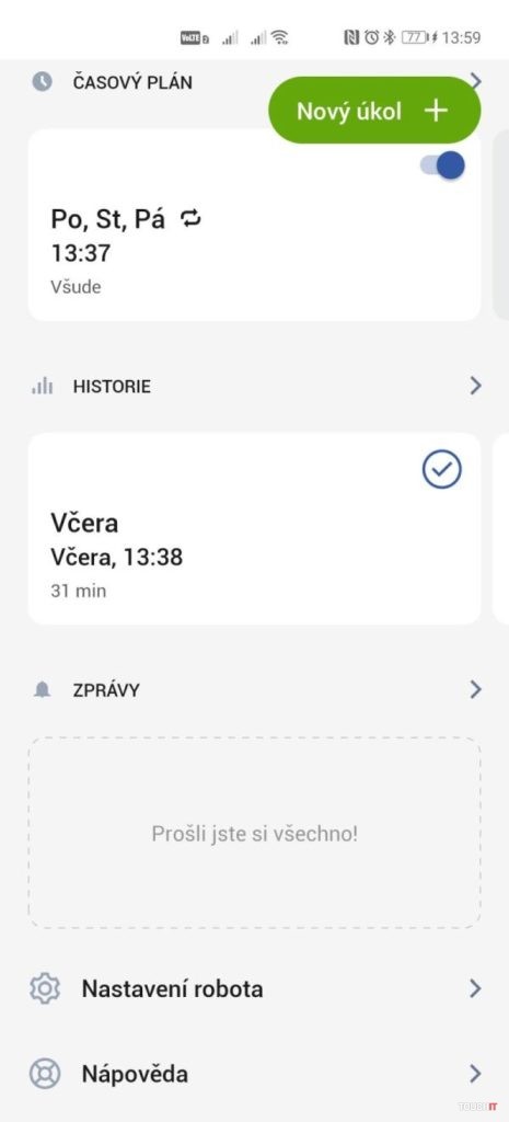 Spodná polovica úvodnej obrazovky obsahuje informácie o vytvorených časových plánoch, ktoré si môžete rýchlo skontrolovať alebo upraviť. Rovnako si môžete pozrieť detailnú históriu upratovania aj s podrobnými údajmi o konkrétnych vysávaniach a mopovaniach