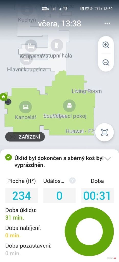 Takto vyzerá obrazovka s informáciami o vysávaní. Robota sme poslali iba do dvoch izieb domácnosti