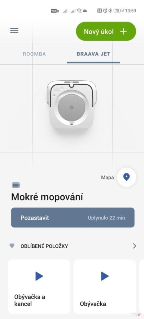 Keďže máme v domácnosti nielen robotický vysávač, ale aj mop, tak sa môžeme medzi zariadeniami prepínať a sledovať, čo práve robia. Mop v tomto prípade mopuje, základné informácie máme hneď poruke
