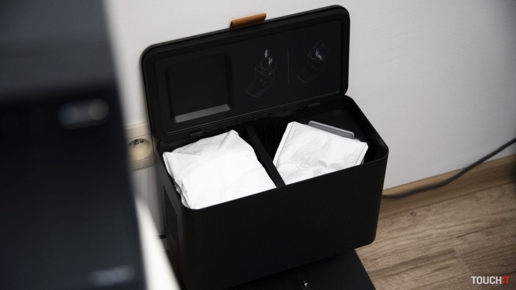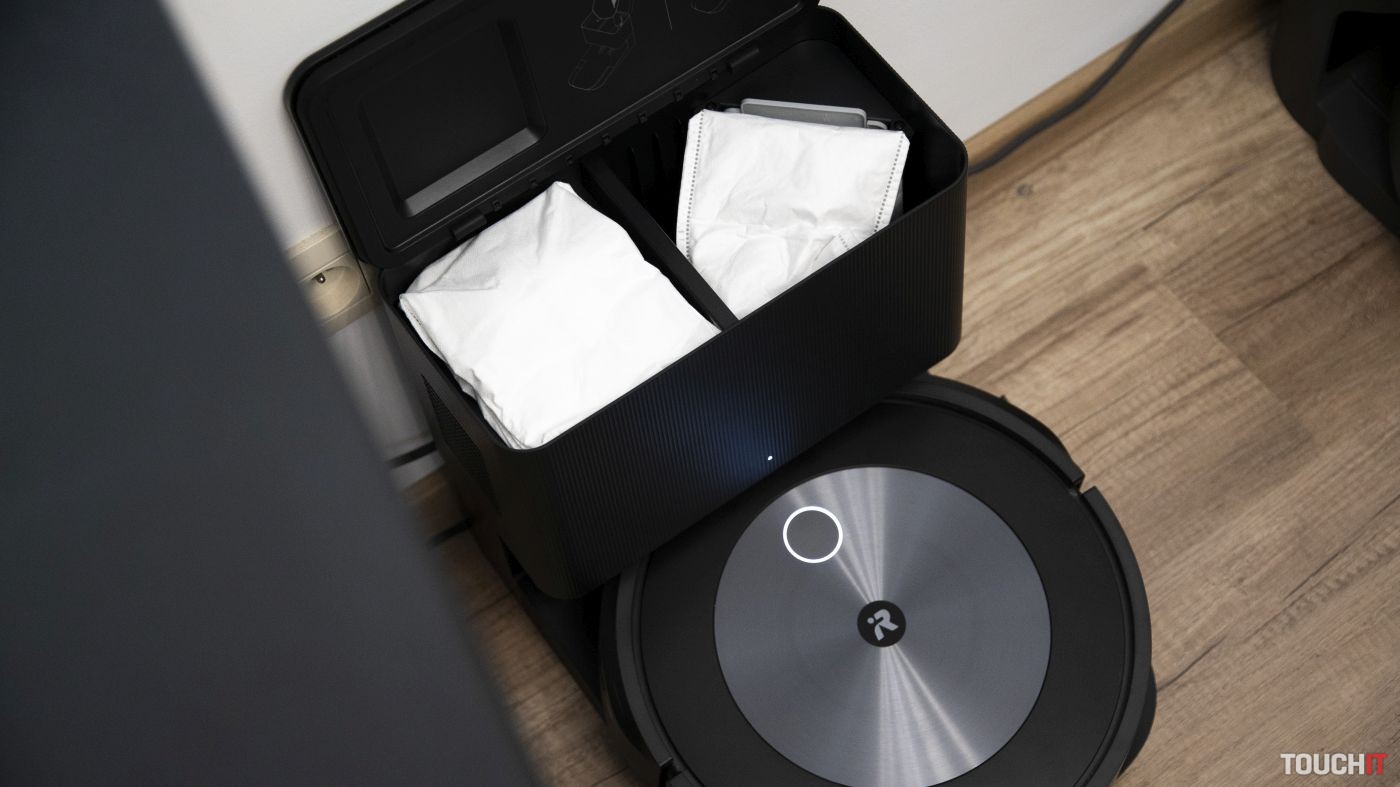 iRobot Roomba j7+ disponuje kompaktnejšou dokovacou stanicou s odpadkovým košom. Ľavé vrecúško na fotke je náhradné, aby ste ho mohli v prípade potreby vymeniť. Drobný detail, ktorý poteší