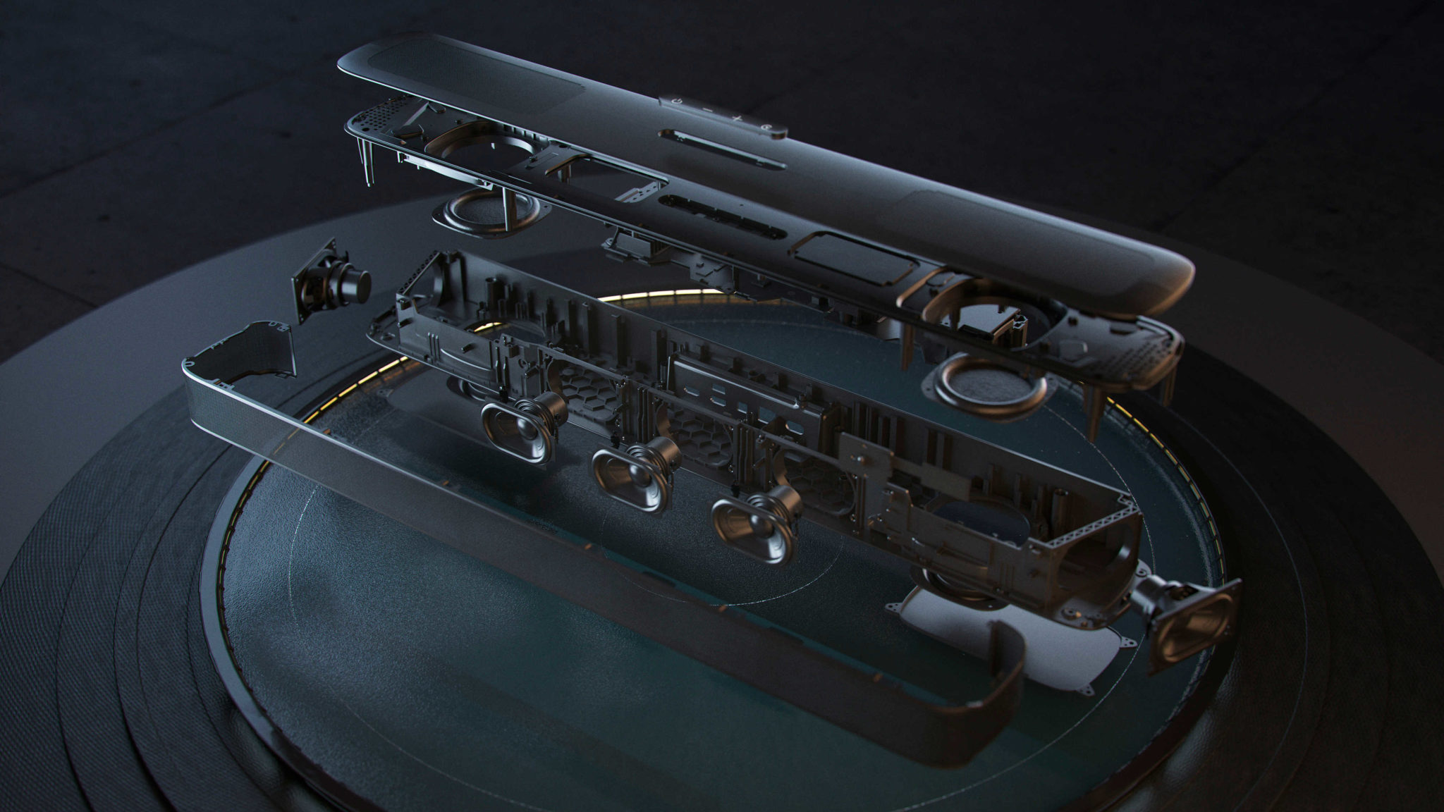 Dopredu smerujú tri hlavné reproduktory, po oboch stranách sú dva multibeam reproduktory, ktoré dodávajú priestorový charakter zvuku. K tomu sú ešte dva výkonné basové reproduktory. Aj napriek tomu, že jeho súčasťou nie je samostatný subwoofer, o hlboké tóny určite neprídete.