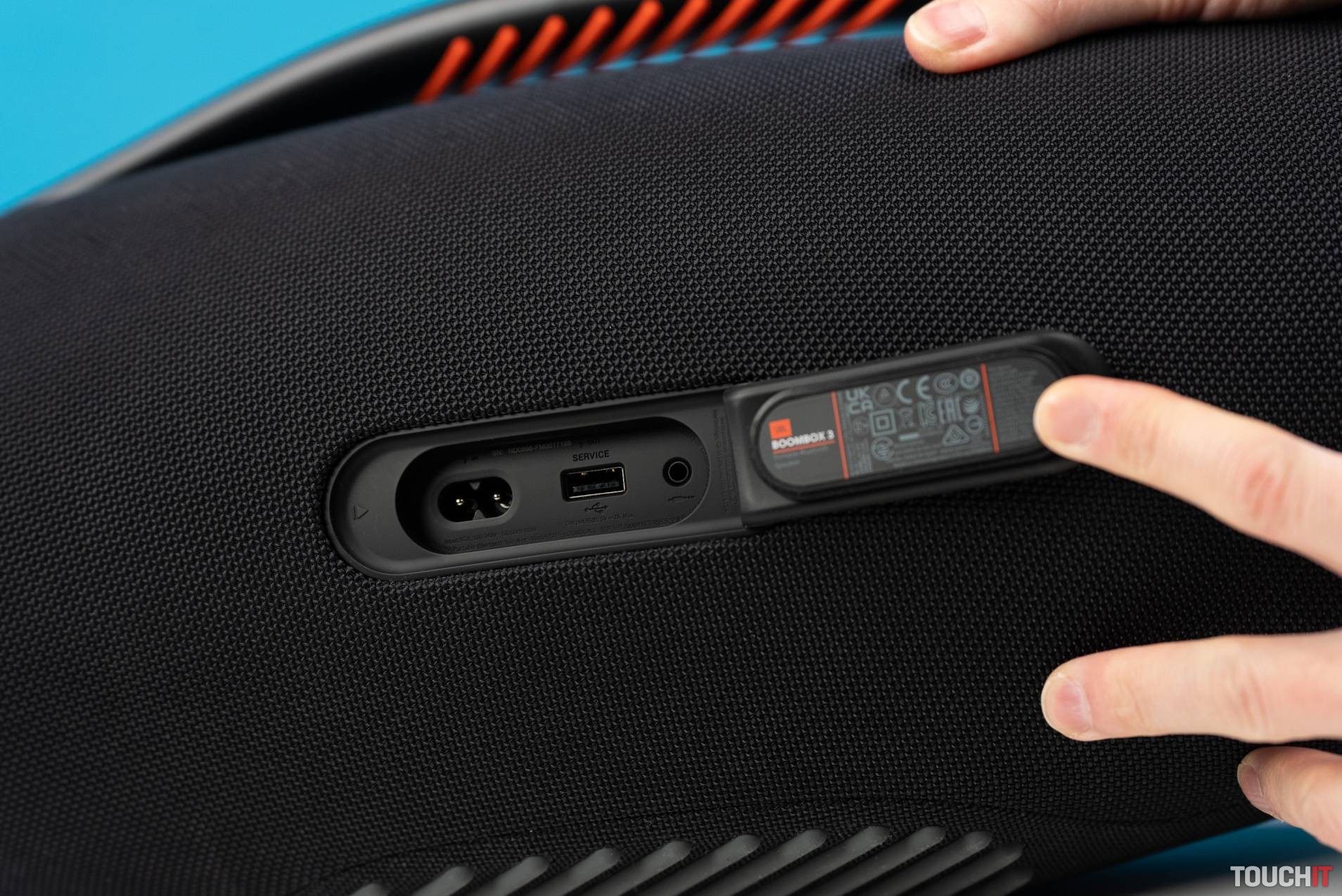 Na zadnej strane za gumovým krytom sú USB-A konektor na nabíjanie iných zariadení s výstupom 10 W, konektor na nabíjanie cez vlastný kábel a prepojovací 3,5 mm konektor.