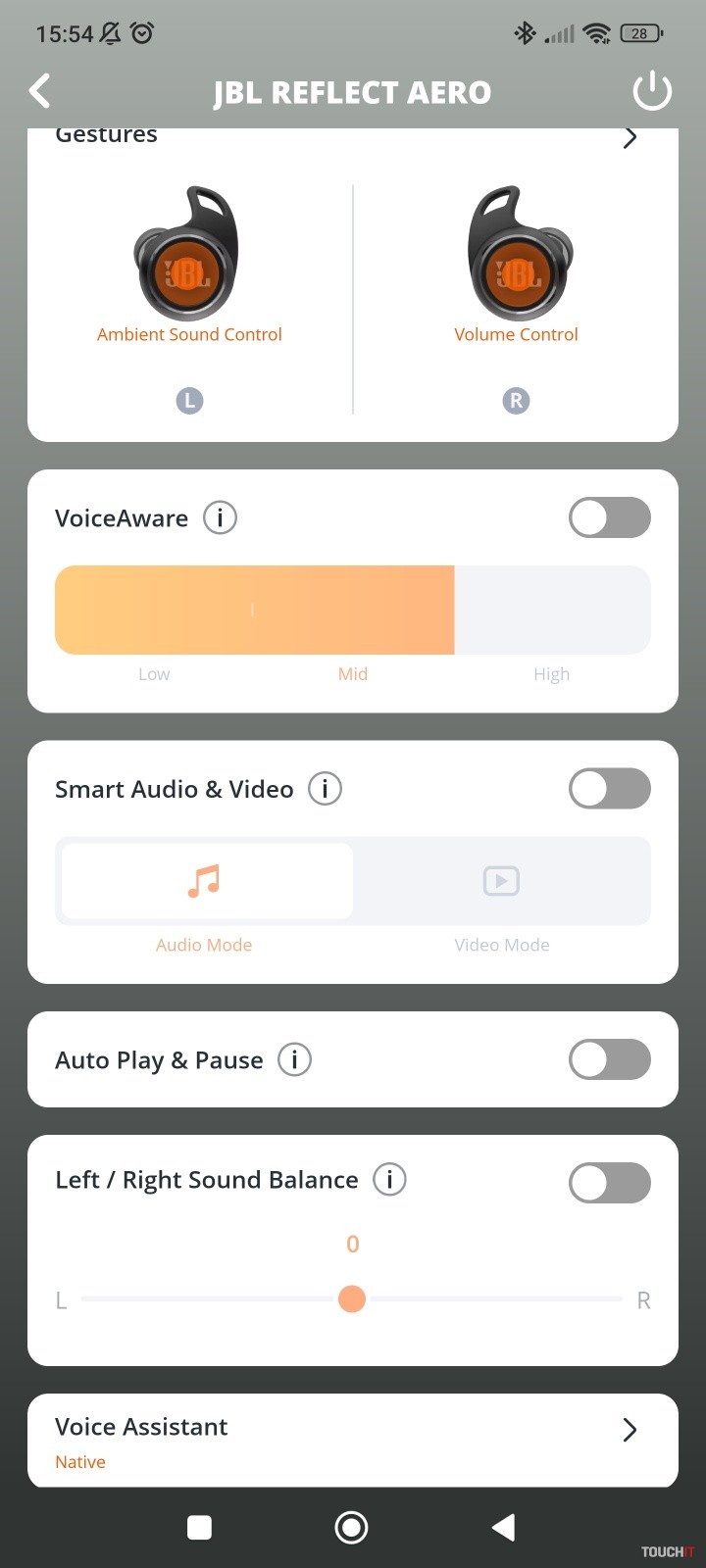 V rámci detailných nastavení je možné nastaviť aj kompenzáciu zvukového kanálu a vykonať test na základe okolitých zvukov. Súčasťou je aj prispôsobenie si dotykového ovládania ľavého a pravého slúchadla. V prípade, že niekomu nevyhovuje dotykové ovládanie, dá sa kompletne vypnúť.