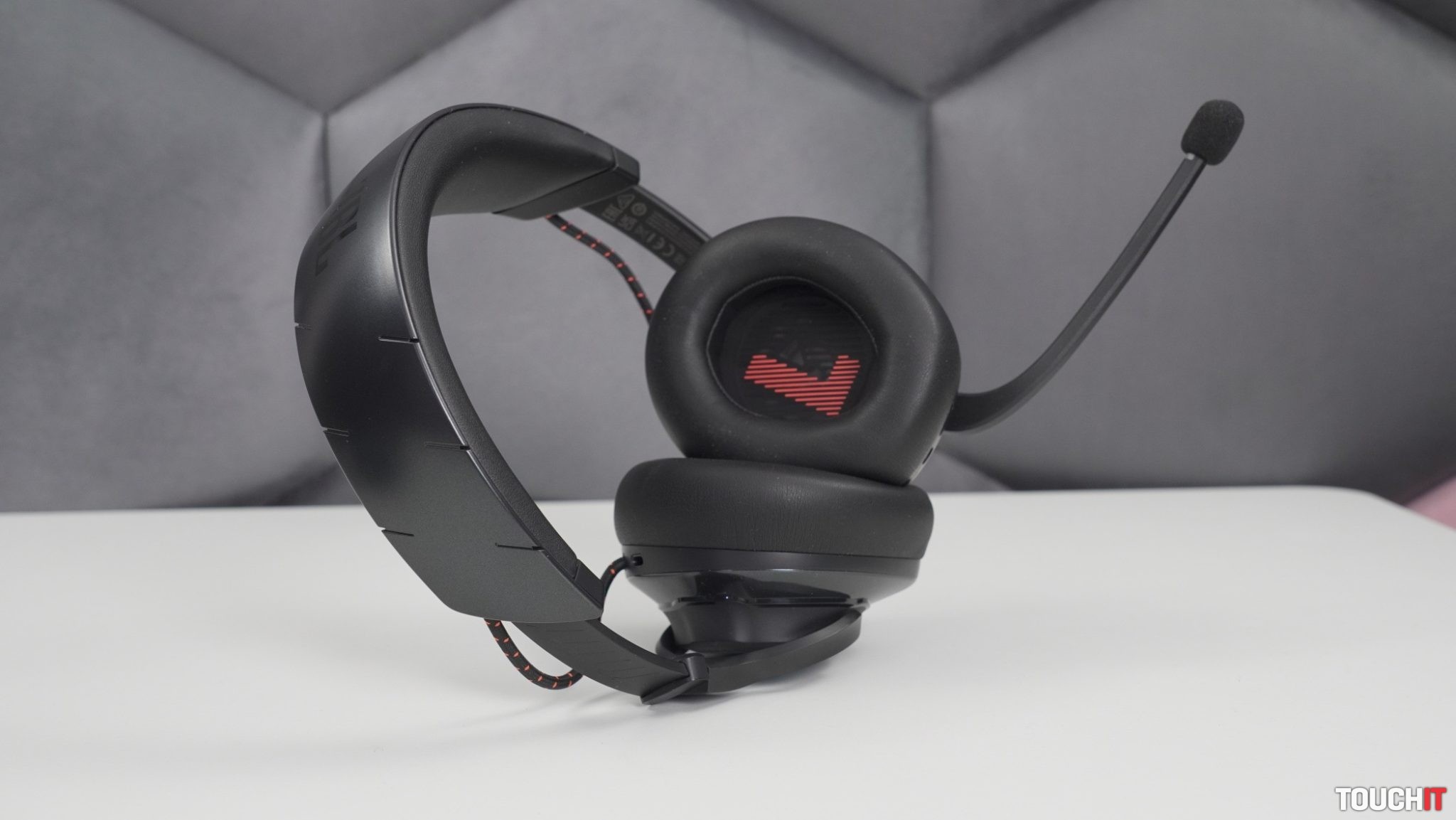 Páčil sa nám aj výklopný mikrofón. Jeho zaklopenie súži aj ako vypínač, no na ľavej mušli je tlačidlo na stlmenie mikrofónu. Používajú 50 mm meniče a výrobca vyladil zvuk technológiou JBL QuantumSURROUND. Priestorový zvuk si nastavujete softvérovo. Na ľavej mušli sú teraz dve kolieska. Jedno na ovládanie hlasitosti, druhé na nastavenie toho, či chcete počuť dianie v hre alebo ostatných hráčov, napríklad pri komunikácii cez Discord.