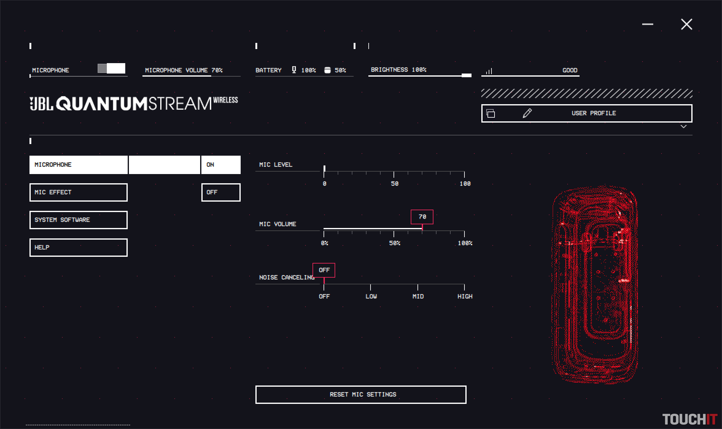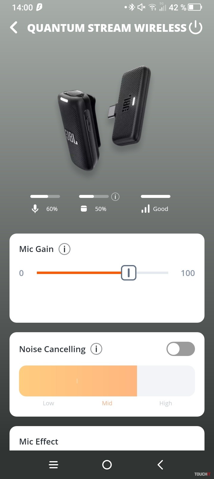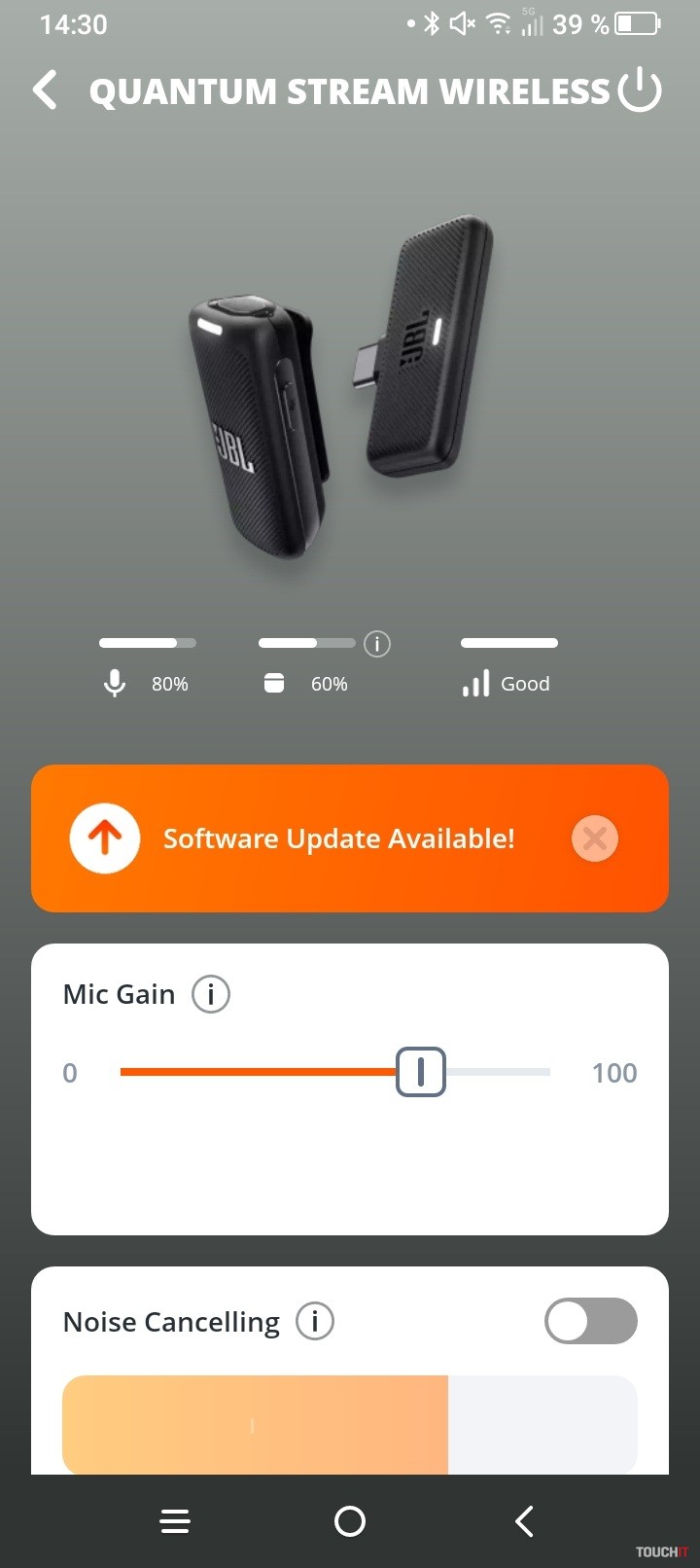Na prispôsobenie vlastností mikrofónu sa dá použiť aplikácia JBL Headphones. Prvotné spárovanie vyžaduje hardvérový kľúč mikrofónu pripojiť do konektora k smartfónu. Pripojenie a celkové spárovanie je jednoduchšie, keďže stačí zasunúť kľúč do konektora. Následný prenos funguje vo vlastnom 2,4 GHz pásme, nie je potrebné aktivovať Bluetooth spojenie. Dosah zariadení je 100 m, čo dáva skutočnú voľnosť pri tvorbe videa. V aplikácii je vidieť aj kvalita signálu.