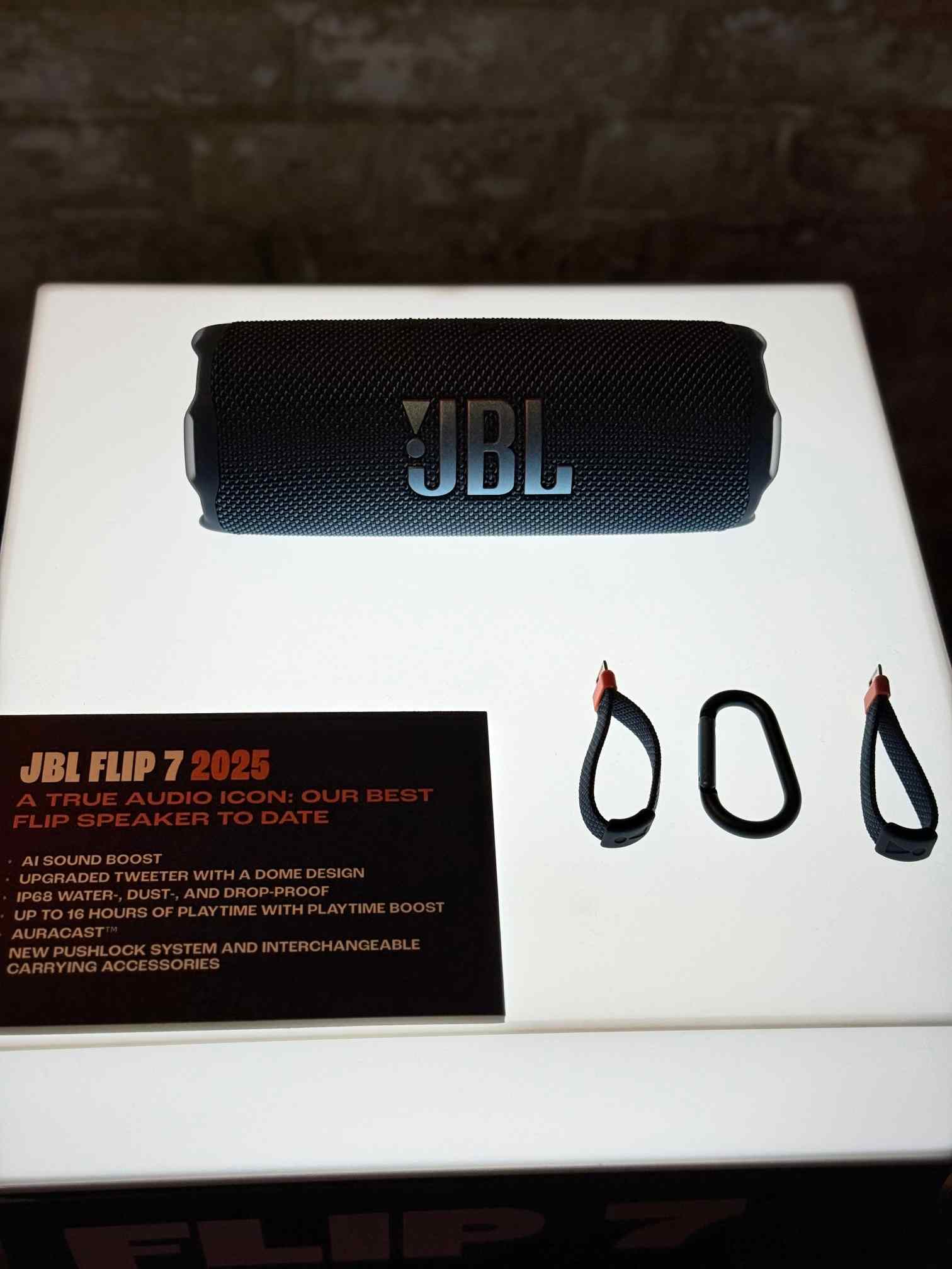 Medzigeneračnej obmeny sa dočkal aj reproduktor JBL Flip 7. Takisto podporuje AI zvuk a zvýrazňuje basy bez nežiaduceho skreslenia. Na prenášanie tentoraz výrobca použil praktickú karabínu a pútko na prst. Rovnako však ide o rozmerovo menší reproduktor, ktorý sa pohodlne zmestí do batohu. Má certifikáciu IP68, to znamená, že sa dá použiť v akomkoľvek prostredí. Nechýba podpora Auracast na prepojenie s inými zariadeniami a na 1 nabitie vydrží až 16 hodín.