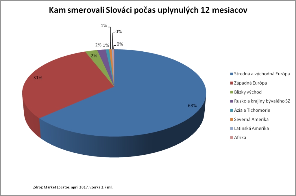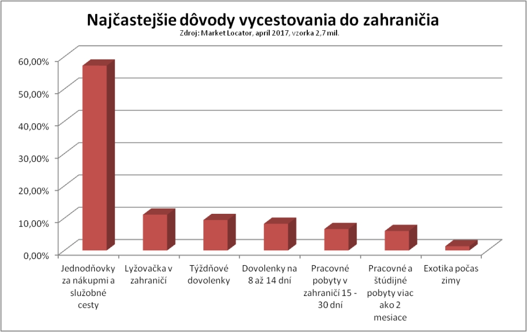 Market Locator umožní identifikovať najčastejšie účely zahraničných pobytov napríklad podľa ročného obdobia, dĺžky pobytu, destinácie a ďalších parametrov a výsledné podiely znázorňuje nasledujúci graf. Zaujímavé číslo získame spočítaním dlhodobých pobytov od 15 dní až po niekoľko mesiacov, dá sa povedať, že každé 10 vycestovanie je za prácou prípadne študovaním v zahraničí.