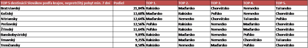 Pozrime sa však aj na to, ako sa líšia naše cestovateľské preferencie, podľa toho, v ktorom kraji bývame. Aby bol prehľad objektívnejší a neboli započítané krátkodobé pobyty v najbližších krajinách, tak pre dovolenkové destinácie bola stanovený limit nepretržitého pobytu minimálne 7 dní. Napriek tomuto opatreniu, jednoznačne víťazí Česká republika ako TOP destinácia pre všetkých Slovákov.