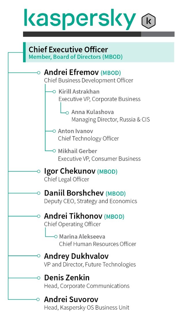 USA vydali sankcie aj voči 12 členom vedenia spoločnosti pre podozrenie z napojenia na ruskú vládu. Sankcie sa zatiaľ netýkajú zakladateľa firmy Eugena Kasperskeho. Ministerka obchodu Gina Raimondo uviedla, že Rusko opakovane ukázalo schopnosť využívať ruské spoločnosti na zhromažďovanie citlivých informácií. Vykonané opatrenia by podľa slov námestníka Alana Esteveza mali znamenať bezpečnejší kybernetický svet v krajine.