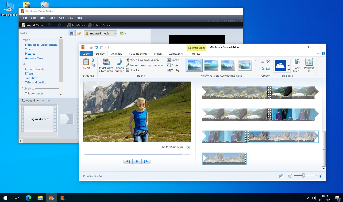 Movie Maker nainštalovaný na systéme Windows 10. V pozadí stará verzia 6 určená pre Vistu a v popredí posledná verzia (16) pre Windows 7 a 8.