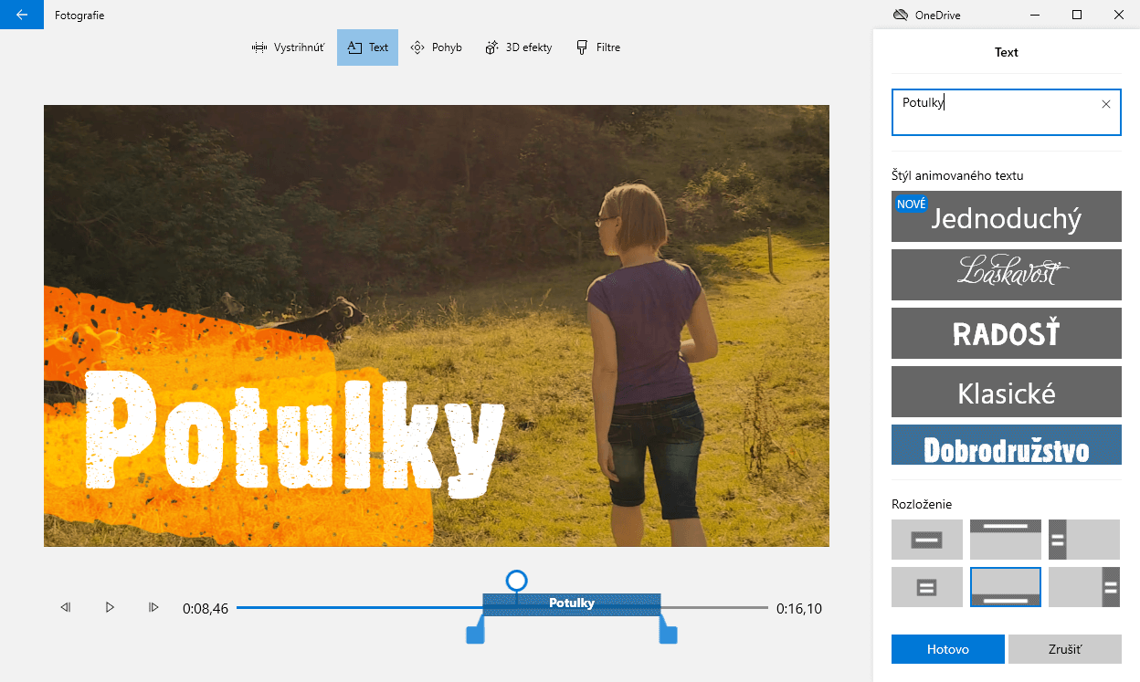 Do videa môžete vložiť napríklad text, ktorý do konkrétnych častí umiestnite pomocou rovnomenného tlačidla. Opäť sa zobrazí okno, v ktorom si nastavíte, kde text vo videu chcete zobraziť, čo má hovoriť a takisto posunom jazdcov nastaviť, v ktorej časti videa sa má text plynulo objaviť a následne zas zmiznúť.