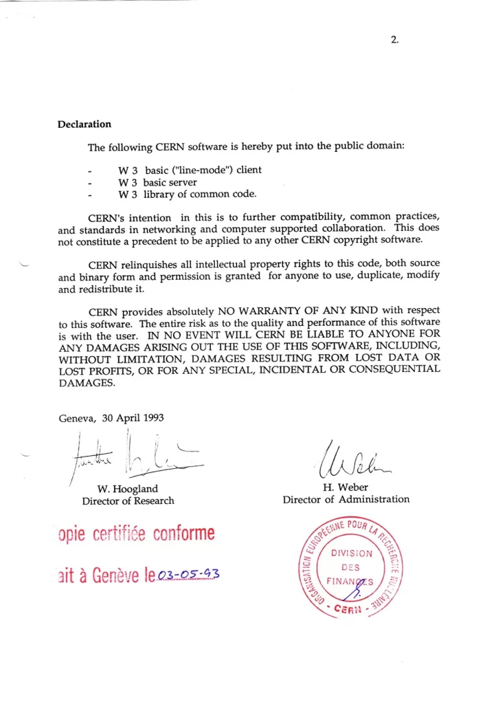 V tom čase sa technický svet otočil na Tima a CERN a čakali, ako zareagujú oni. Odpoveď bola presne opačná. CERN ohlásil, že web má fungovať ako celkom otvorený štandard, bez akýchkoľvek limitácií, pričom sa vzdal akýchkoľvek vlastníckych a licenčných práv. Za Gopherom tak definitívne zavrel veko od rakvy a svet sa natrvalo zmenil.