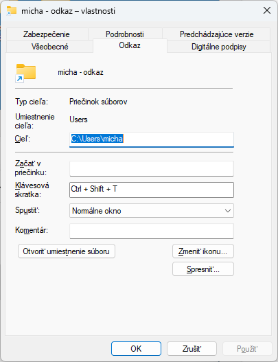 Na odkaze kliknite pravým tlačidlom a vyberte Vlastnosti. Na karte Odkaz je políčko Klávesová skratka. Umiestnite kurzor do tohto políčka a stlačte klávesy podľa požadovanej kombinácie. Potvrďte tlačidlom OK a odteraz sa adresár bude otvárať aj stlačením vašej kombinácie klávesov.