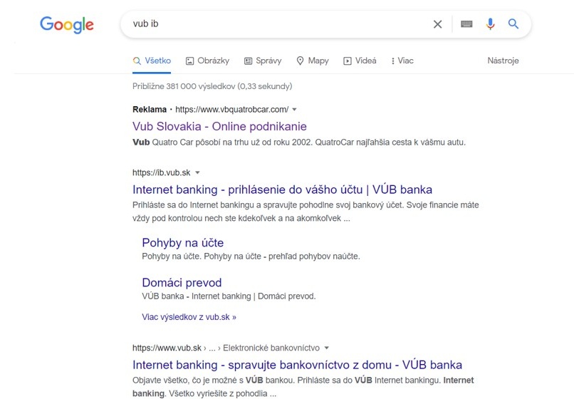 Po zadaní kľúčových slov v prehliadači spojených so službami alebo produktami VÚB (ako napríklad „vub ib“, „vub banking“, „vub quatro“ a podobne), vám môže spomedzi prvých vyhľadaní naskočiť aj reklamný odkaz. Ten vás následne presmeruje na podvodnú stránku online bankovníctva.