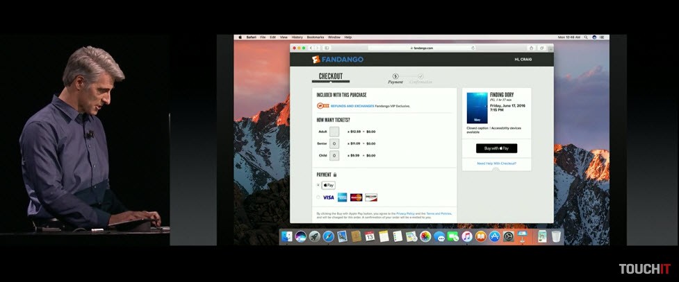 19:50 : Apple ukazuje ako je možné pomocou Siri vybrať film v kine, zakúpiť lístok a cez Apple Pay aj zaplatiť. macOS príde vo finálnej verzii na jeseň.