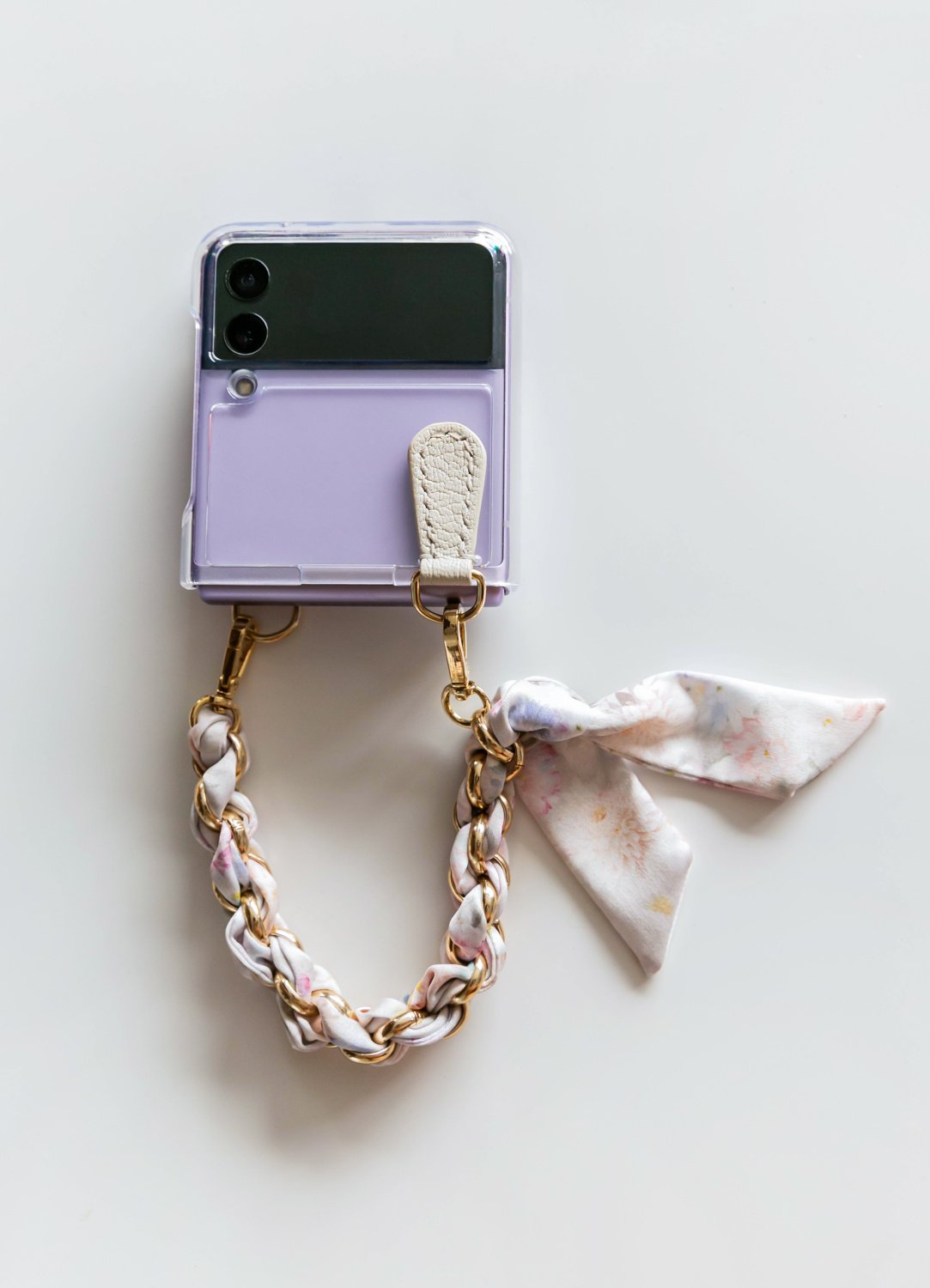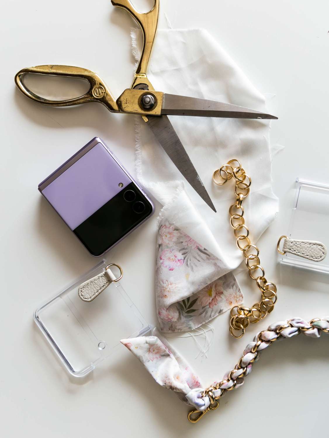 Jej návrh vychádza z originálneho priesvitného puzdra Samsung, na ktorom sú ručne prišité pútka z bledej opracovanej kože, do ktorých sú vložené zlaté očká. Na tie sú zachytené rovnako zlaté karabínky, ktoré spája reťaz v zlatej farbe pretkaná ručne šitou šatkou s kvetinovým motívom.