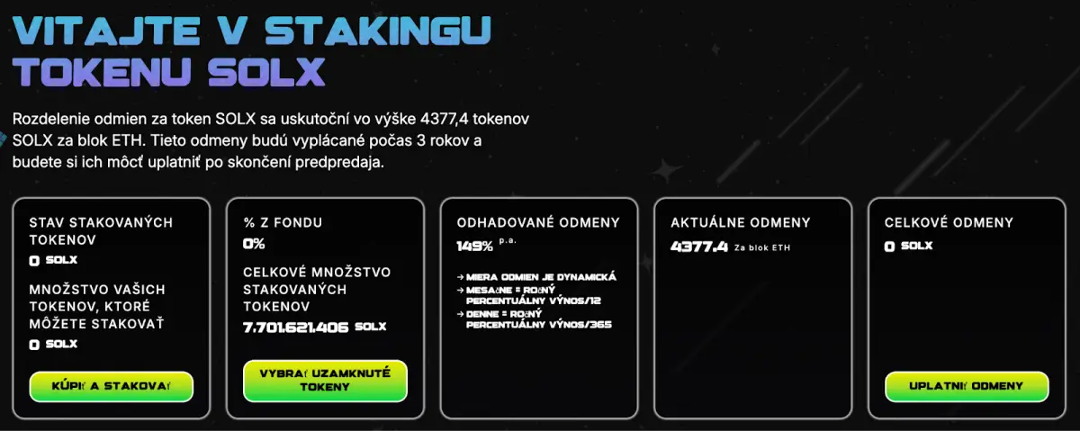 Energeticky nenáročný konsenzus Proof-of-stake držiteľom tokenov SOLX tiež ponúka vybudovať si nemalý pasívny príjem. Odhadovaný výnos za uzamknutie vašich tokenov v súčasnej fáze predpredaja je 149 % APY. Viac informácií o tom, ako najlepšie využiť staking, vám vo svojom videu povie JNVCK Crypto.