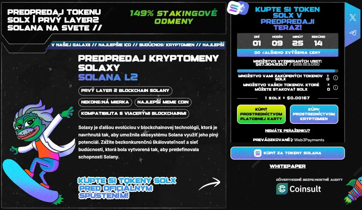 Svoje investičné portfólio si môžete rozšíriť aj o jedinečný Layer 2 projekt Solaxy vypĺňajúci nedostatky solanovej siete. Ide vôbec o prvý projekt tohto charakteru, ktorý rieši problémy s častým preťažením Solany.