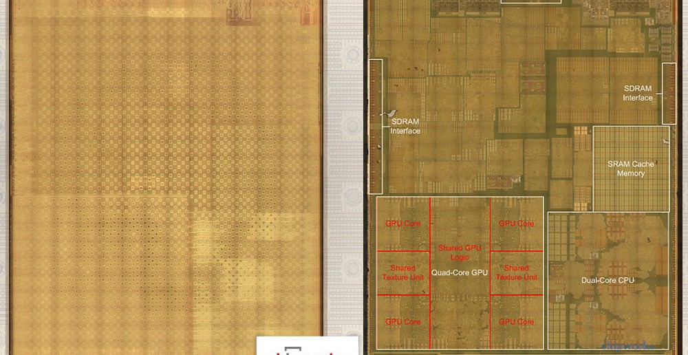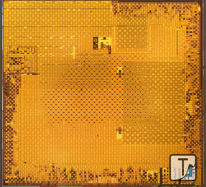 Analytická spoločnosť Chipworks, ktorá sa zaoberá reverzným inžinierstvom polovodičových technológií, vykonala profesionálny rez celým čipom, vďaka čomu sa môžeme pokochať jeho útrobami.