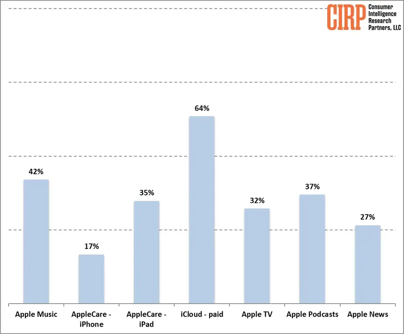 Prieskum spoločnosti CIRP neobsahuje detailné informácie o tom, koľko percent používateľov si platí za akú veľkosť, avšak za iCloud platia takmer 2/3 amerických používateľov (64 %). Druhou najobľúbenejšou službou je Apple Music (42 %). Nasledujú Apple Podcasty (37 %) a Apple TV+ (32 %).