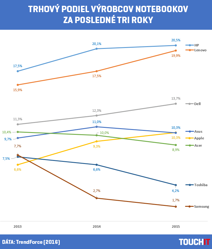 Za celý minulý rok predal najviac notebookov americký Hewlett-Packard a patrí mu 20,5 % trhu. V tesnom závese je čínska spoločnosť Lenovo s 19,9 % podielom, nasledovaná s väčším odstupom americkým Dellom, ktorému patrí 13,7 % trhu.