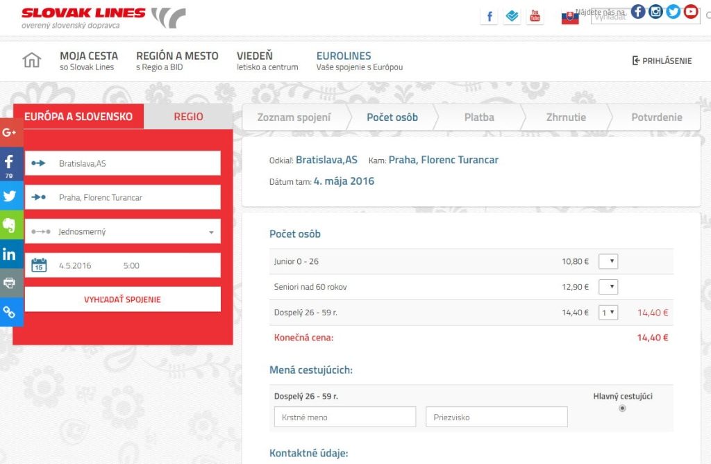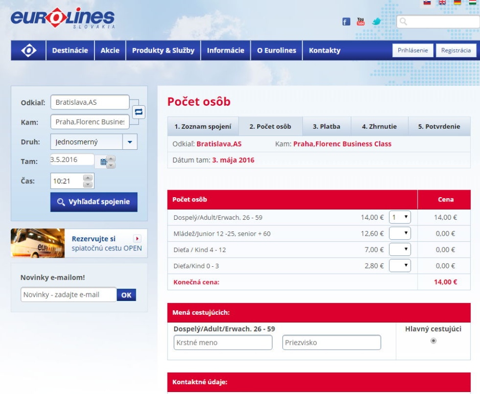 Svoj cestovný lístok si môžete zakúpiť aj u dopravcu Eurolines. Princíp nakupovania akoby z oka vypadol Slovak Lines alebo naopak. Na tom vôbec nezáleží. Pointa zostáva – elektronický lístok si musíte vytlačiť. Tu však vidíte aj postup pri kúpe lístka a teda vidíte v akej časti procesu sa nachádzate. Ide celkovo o päť obrazoviek, cez ktoré treba na úspešné dokončenie kúpy prejsť.