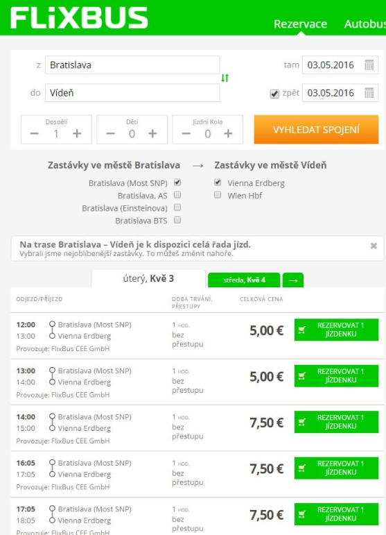V prípade tohto dopravcu je vidieť veľký pokrok najmä pri cestovaní do Viedne a na letisko Schwechat. Iste, cestovať môžete aj inde. Pre náš príklad sme vyskúšali vyhľadať spojenie z Bratislavy do Prahy na Florenc. Vyberiete si počet cestujúcich na daný cestovný lístok a potvrdíte svoj výber. Tu je potrebné ešte cestovné lístky tlačiť. Je to krok späť a jemne znepríjemňuje cestu. Nedá sa tak kupovať napríklad z kaviarne, ak nemáte poruke tlačiareň.