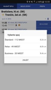 - Rozkliknutím vybraného spoja uvidíte tri triedy komfortu. Zároveň ich cenu aj počet voľných miest. Stačí kliknúť na vybranú triedu (Standard, Relax alebo Business)
