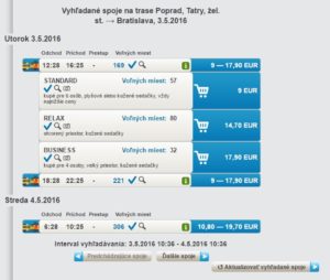 - Rezervačný systém nájde vždy spoje na aktuálny deň, prípadne na ďalšie, ak nie sú na dnes dostupné spoje z dôvodu obsadenosti alebo už po odchode niektorej z vlakových súprav