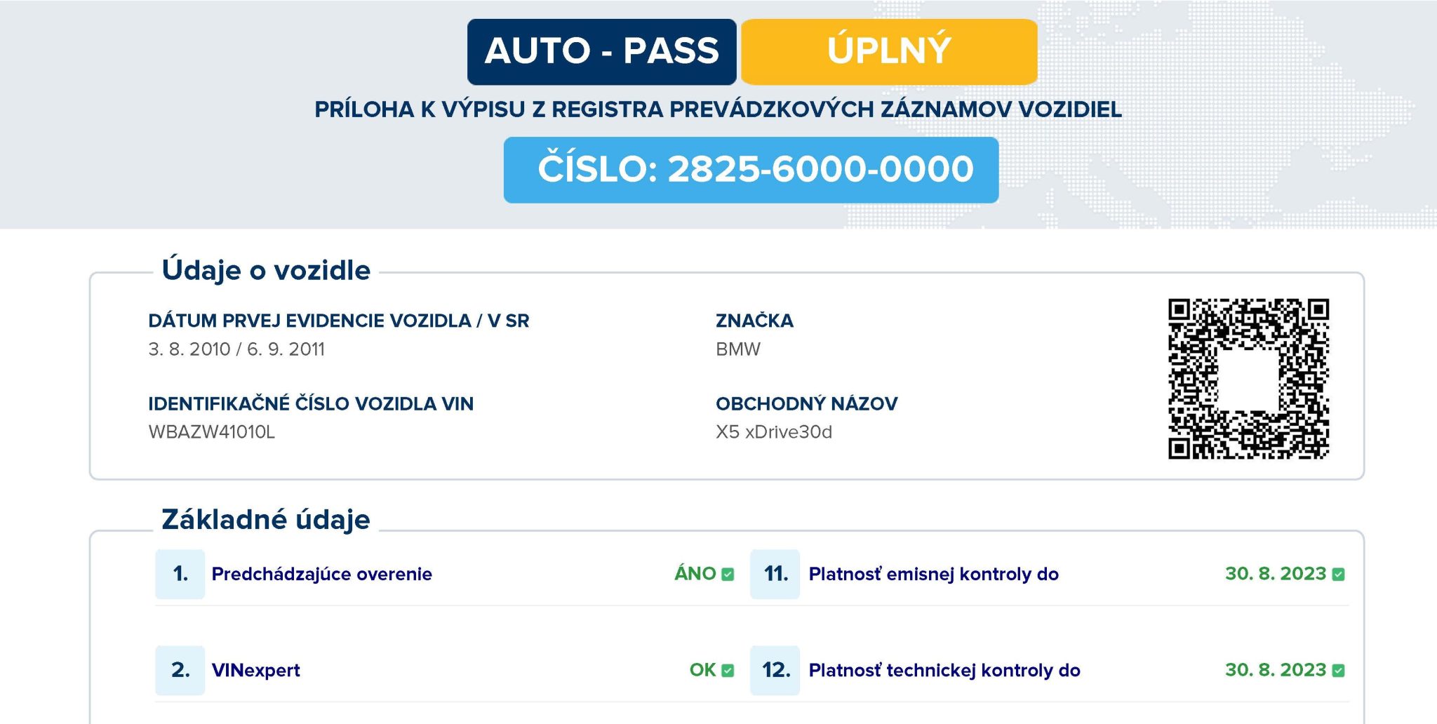 AUTO-Pass poskytuje aktuálne informácie o každom vozidle registrovanom v SR. V najvyššej verzii obsahuje 20 položiek. Získate ho opäť priamo na webe RPZV alebo u poskytovateľov výpisov. Každý nový AUTO-Pass sa zaznamená do RPZV a stáva sa súčasťou historických záznamov o vozidle.