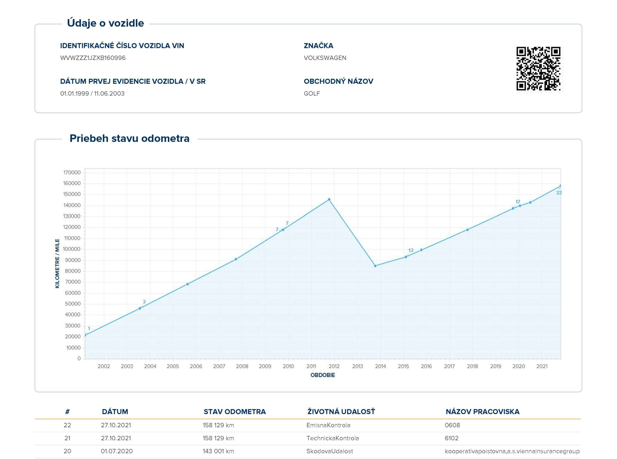 Kompletnú históriu nájazdu vozidla zobrazuje ODO-Pass. Tu vidíte stav kilometrov zapísaných pri každej servisnej prehliadke, pri TK, EK, KO alebo pri ďalších úkonoch ako napríklad oprava, poistenie vozidla atď. Informácie z tohto registra sú jediným oficiálnym zdrojom, ktorý poskytuje relevantné údaje o histórii najazdených kilometrov prevažne z územia SR. Získate tak spoľahlivý prehľad o tom, či je priebeh stavu kilometrov reálny a odometer nebol stočený.