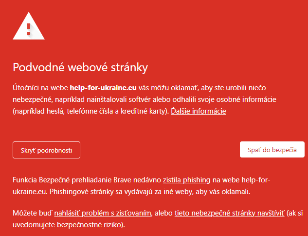 V tejto súvislosti upozorňuje ESET aj na niektoré podvodné weby, ktoré sa snažia zneužiť situáciu na Ukrajine. Oficiálny web, kde sa môžete zapojiť s pomocou alebo získať maximum potrebných informácií je napríklad ktopomozeukrajine.sk. Tu je príklad webov, ktoré sú podvodmi a rozhodne neodporúčame cez ne posielať peniaze.