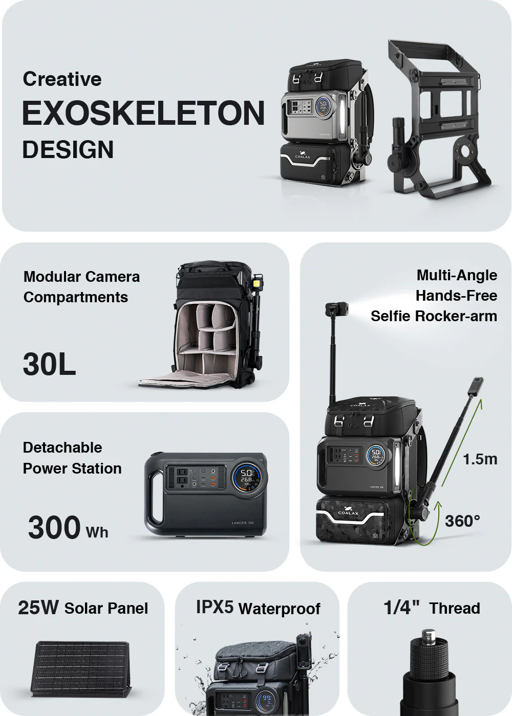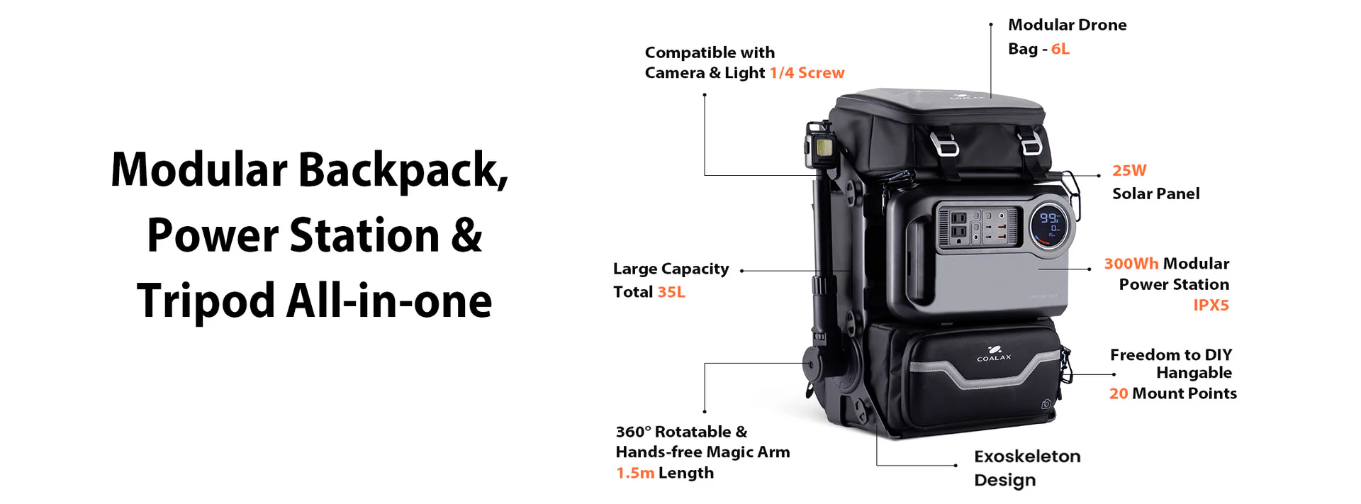 Tento ruksak obsahuje 300 Wh elektrickú stanicu, ktorá má výstup na US sieťovú zásuvku. Zároveň je to ruksak, ktorý obsahuje pamäťový priestor, aby ste nestratili vaše fotky a videá. Zároveň vám dáva aj tretiu ruku, ktorá za vás drží svetlá, mikrofón alebo akčnú kameru.