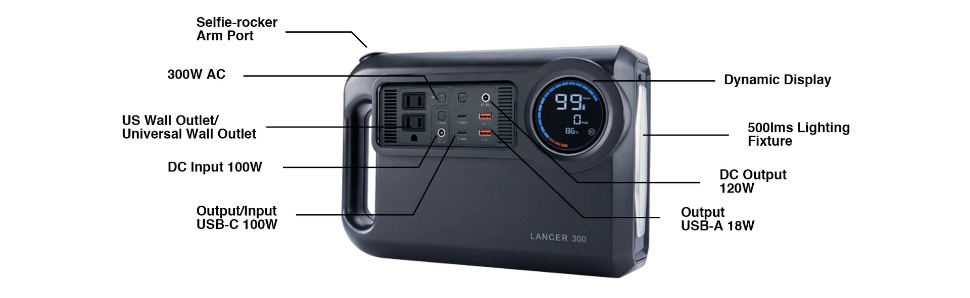 Lancaster300 má modulárny dizajn, vybrať si teda môžete to, čo naozaj potrebujete. Na elektrickej sústave sa nachádzajú rôzne nabíjacie porty, ktoré poskytujú napájanie pre vaše zariadenia a zabezpečujú nabíjanie zariadení priamo v teréne. V spojení s 25 W solárnym panelom funguje táto časť ešte lepšie. Kapacita tejto stanice napr. nabije notebook 4 až 5-krát, fotoaparát až 15-krát. Zásuvka na sieťové napájanie má výstup 120 W, USB-A porty majú obmedzenie na 18 W. Táto stanica má aj stupeň odolnosti IPX5.