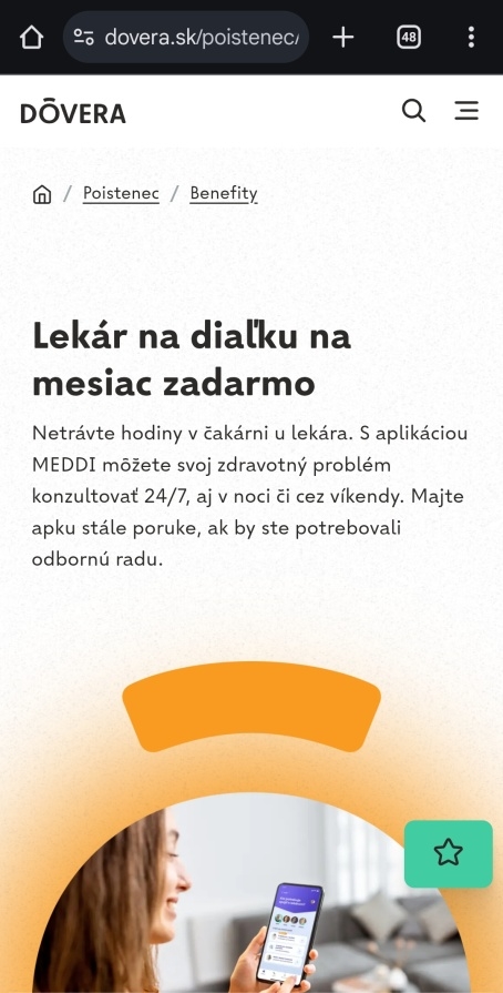Ide o aplikáciu MEDDI, ktorú si nainštalujete na telefón s operačným systémom Android alebo iOS. Túto aplikáciu ponúka priamo cez svoju aplikáciu poisťovňa Dôvera a ako jej poistenec tejto poisťovne máte aj nárok na výraznú zľavu z mesačného predplatného.