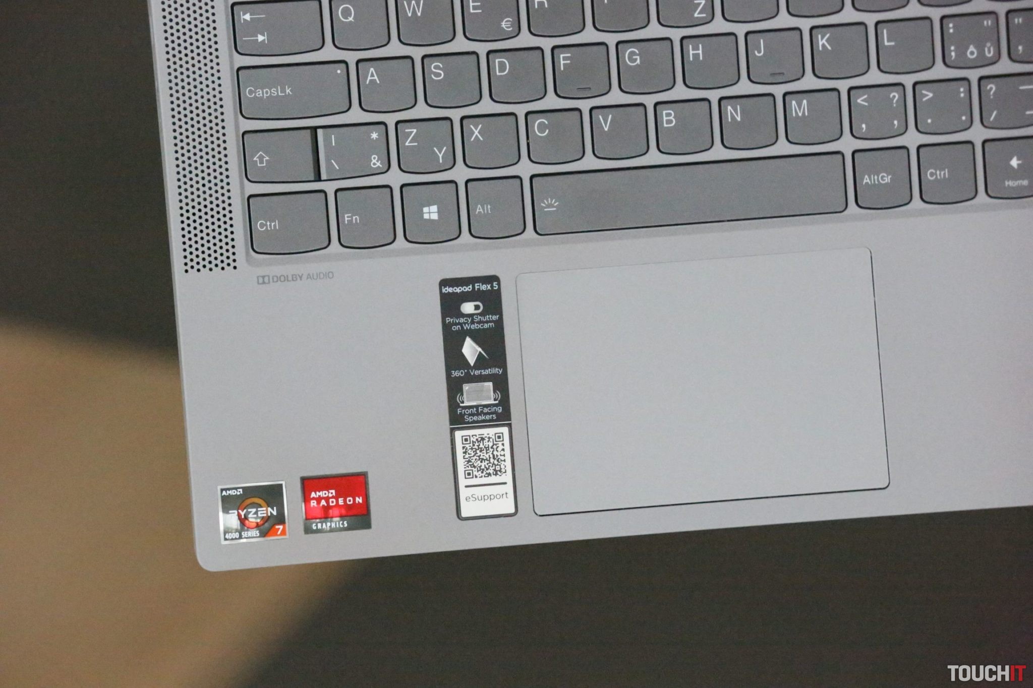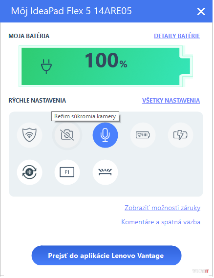 Toto je model, ktorý nemá za úlohu poskytnúť vám čo najtenšie rámiky displeja. Tu to má svoju logiku a pochopíte ju hneď, ako pretočíte displej do režimu tabletu. Reproduktory sú vedľa klávesnice a sú naozaj vynikajúce. Môžete na nich počúvať aj hudbu alebo hrať hry. V tomto smere nás Flex 5 prekvapil. Keď zoberieme do úvahy hardvérovú výbavu, je to veľmi dobrý multimediálny notebook aj na hranie hier. O to viac využijete kvalitu vstavaného audia. Kĺb displeja je pevný a má dobre vyriešené pruženie. Na písanie perom si ho stále bude treba mierne pridržiavať, preto je najpraktickejšie písať po displeji, keď je displej v režime tabletu alebo je veko otvorené na 180°. Pri otváraní kladie väčší odpor, no pri zatváraní je pruženie jemnejšie. Takže sa otvára ľahko, no po otvorení je veko stabilné a displej drží vo vami nastavenej polohe. Displej samotný má svietivosť 250 nitov, namerali sme mierne vyššiu hodnotu, viac údajov nájdete v tabuľke na konci článku. Počas testovania sa to ukázalo ako dostatočné, no je pravda, že sme videli aj lepšie displeji. Tiež je ale pravda, že by ste sa pohybovali v cenovej relácii o pár stovák vyššej. Webová kamera má HD rozlíšenie a je chránená krytom na ochranu súkromia. Toto oceníte a nemusíte si robiť starosti s bezpečnosťou. Stačí zaklapnúť kryt kamery. Kto by chcel ešte väčšiu ochranu, je tu elektronické zabezpečenie priamo cez Lenovo Vantage. Podobne máte prístup k mikrofónu. Stačí ponechať v paneli úloh OS zobrazený panel Vantage a všetky bezpečnostné aj iné funkcie si môžete ľahko prepínať.