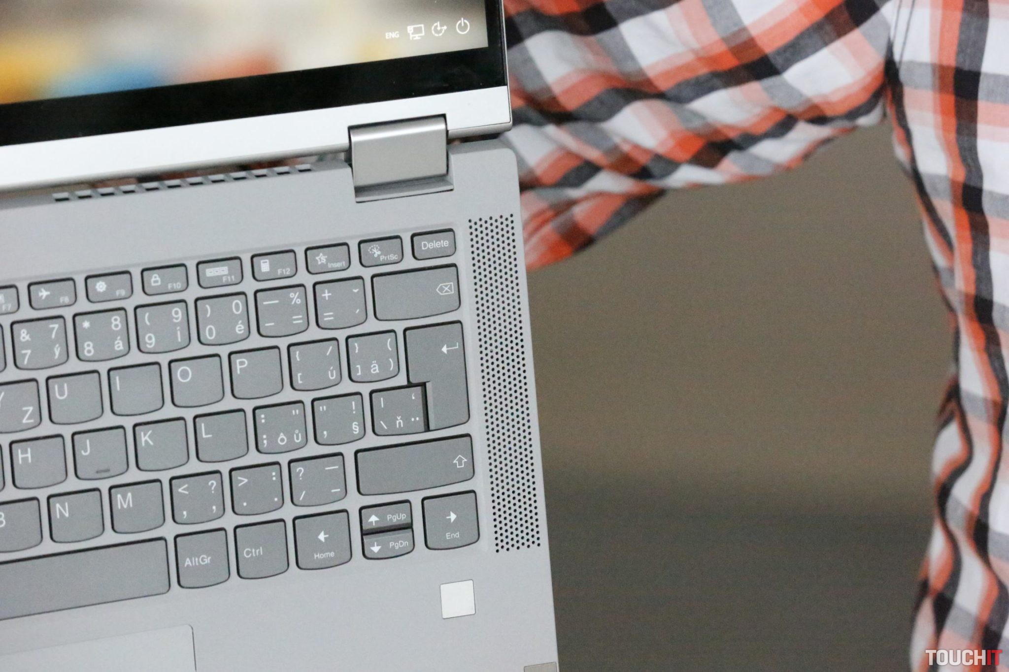V štandardnom režime sa veľmi dobre používa, napríklad aj vďaka podsvietenej klávesnici s dvomi stupňami intenzity bieleho svetla. Klávesnica je tichá, čo je ideálne na prácu kdekoľvek. Nebudete na seba zbytočne upozorňovať a písanie nebude hlučné. Rozloženie klávesov je štandardné, presne tak, ako ho u série IdeaPad poznáte. Na prihlásenie do systému sa dá použiť čítačka odtlačkov prstov pod klávesnicou. Funguje rýchlo a spoľahlivo. Vidno, že čítačky odtlačkov dozreli a výrobcovia sa ich už dávno naučili správne implementovať.