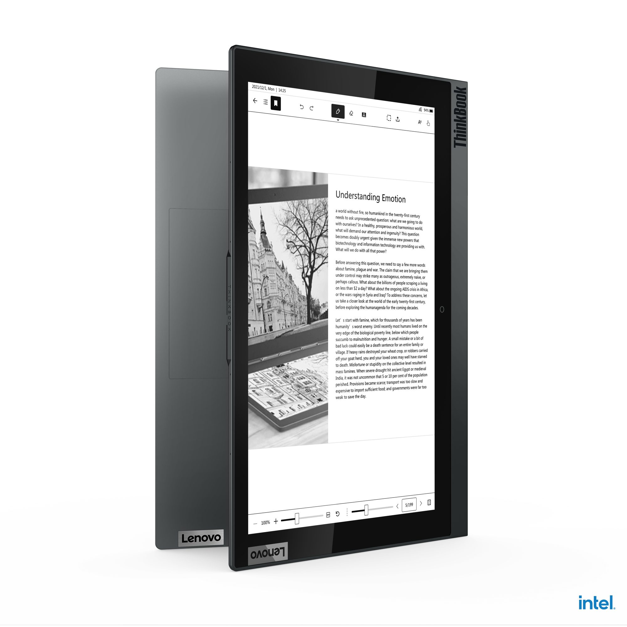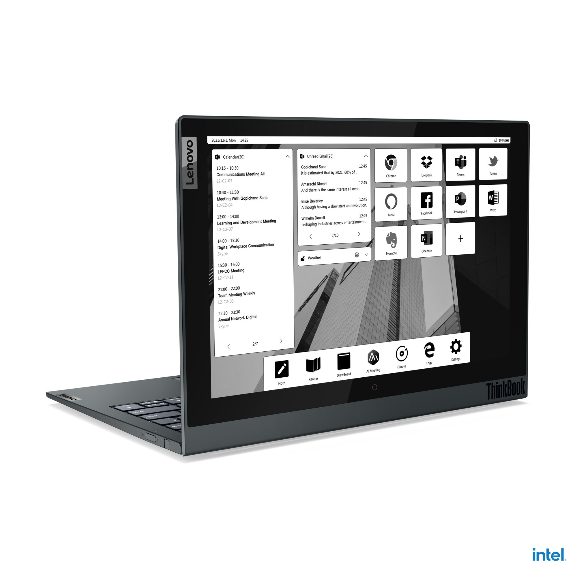 - K možnostiam konektivity patria porty Intel Thunderbolt 4, Wi-Fi 6 a nová voliteľná nabíjacia podložka ThinkBook, ktorá je napájaná technológiou Power by Contact od Energysquare. Tá umožňuje bezdrôtovo nabiť väčšiu batériu až na 15 hodín alebo až na 24 hodín v prípade využívania iba e-Ink displeja.