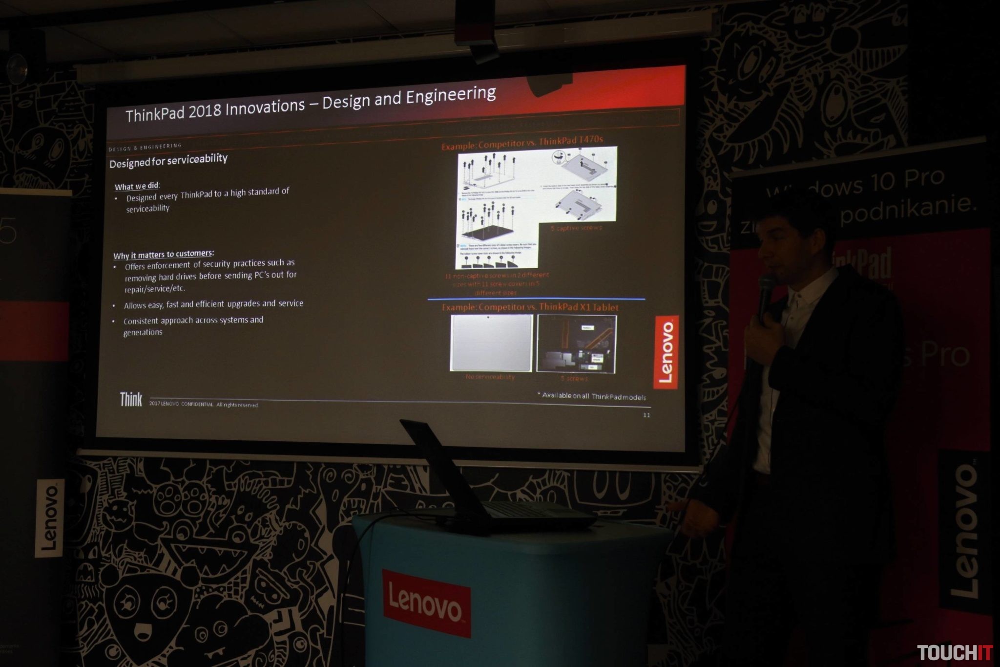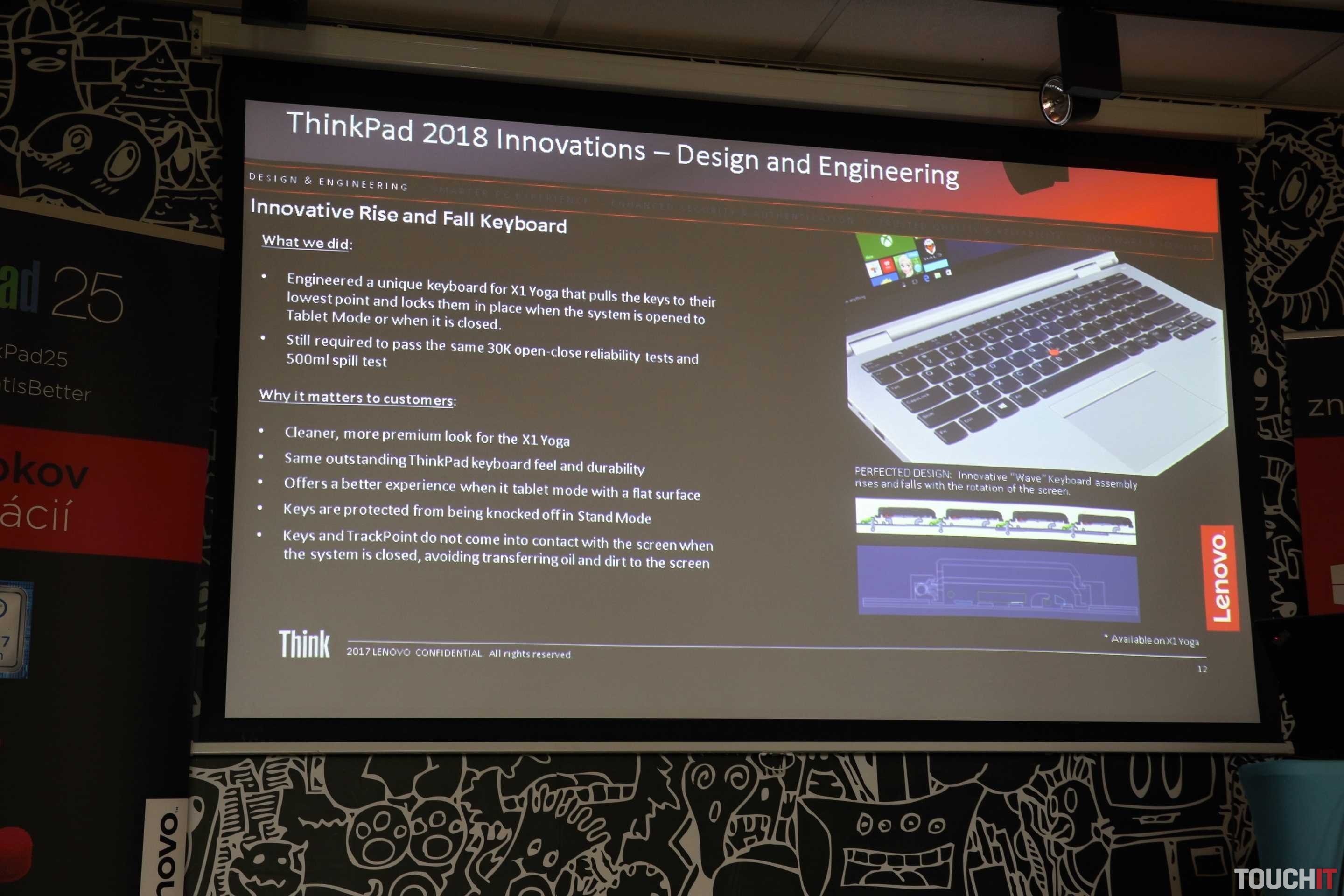 Špecialitou je matný displej, ktorý ja zároveň dotykový. Dotyková vrstva je totiž v zobrazovacej vrstve. Vďaka tomu sa podarilo dosiahnuť rovnakú hrúbku ako pri nedotykových verziách. Verzie Yoga majú Gorilla Glass a výrobca tam stále používa sklo. Je to obrana pri používaní dotykového pera a zároveň a v prípade pádu notebooku.