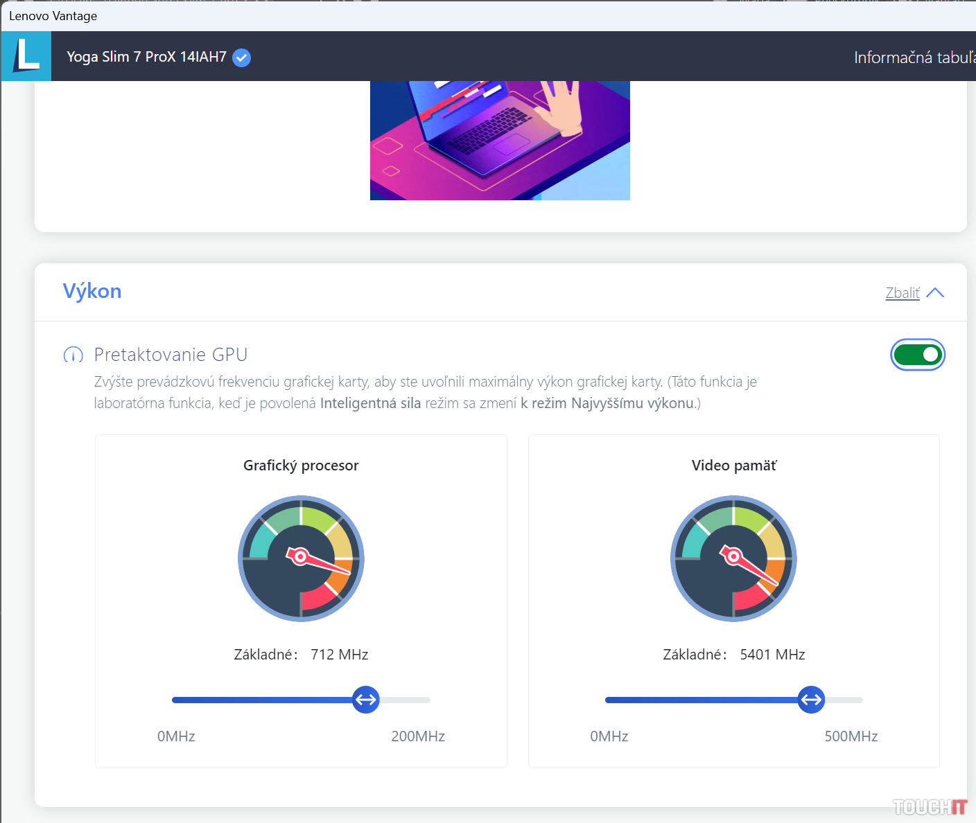 Ide o súčasť, ktorú výrobca do svojich notebookov pridáva už mnohé roky a je to popravde jedna z najlepších funkcií, ktorými si notebook vyladíte podľa svojich predstáv okrem základných. Možnosti ako nastavenie uprednostňovania klávesov F alebo multimediálnych či napríklad spomínané správanie kamery na prihlasovanie alebo uzamykanie systému a tiež je tu možnosť pretaktovania grafickej karty. Ide o dva parametre a to pretaktovanie grafického procesora a pretaktovanie video pamäte.