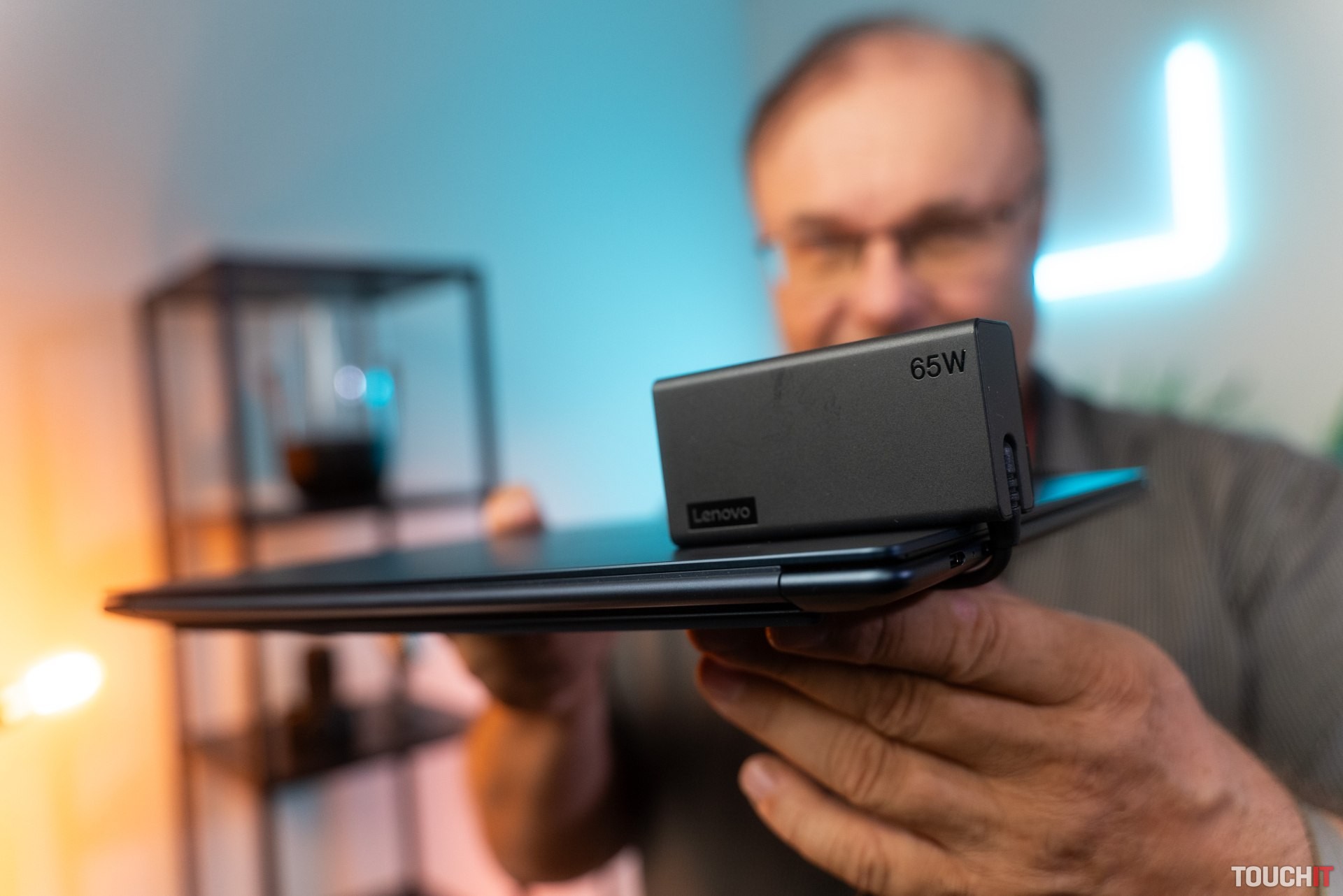 Batéria je štvorčlánková, jej kapacita je 70 Wh. Súčasťou dodávky je 65 W napájací zdroj, ktorý ľahko schováte do vrecka. Už po 15 minútach nabíjania máte dostatok energie na 3 hodiny práce s notebookom. S nabitou batériou vydržíte s notebookom na celý deň v práci.