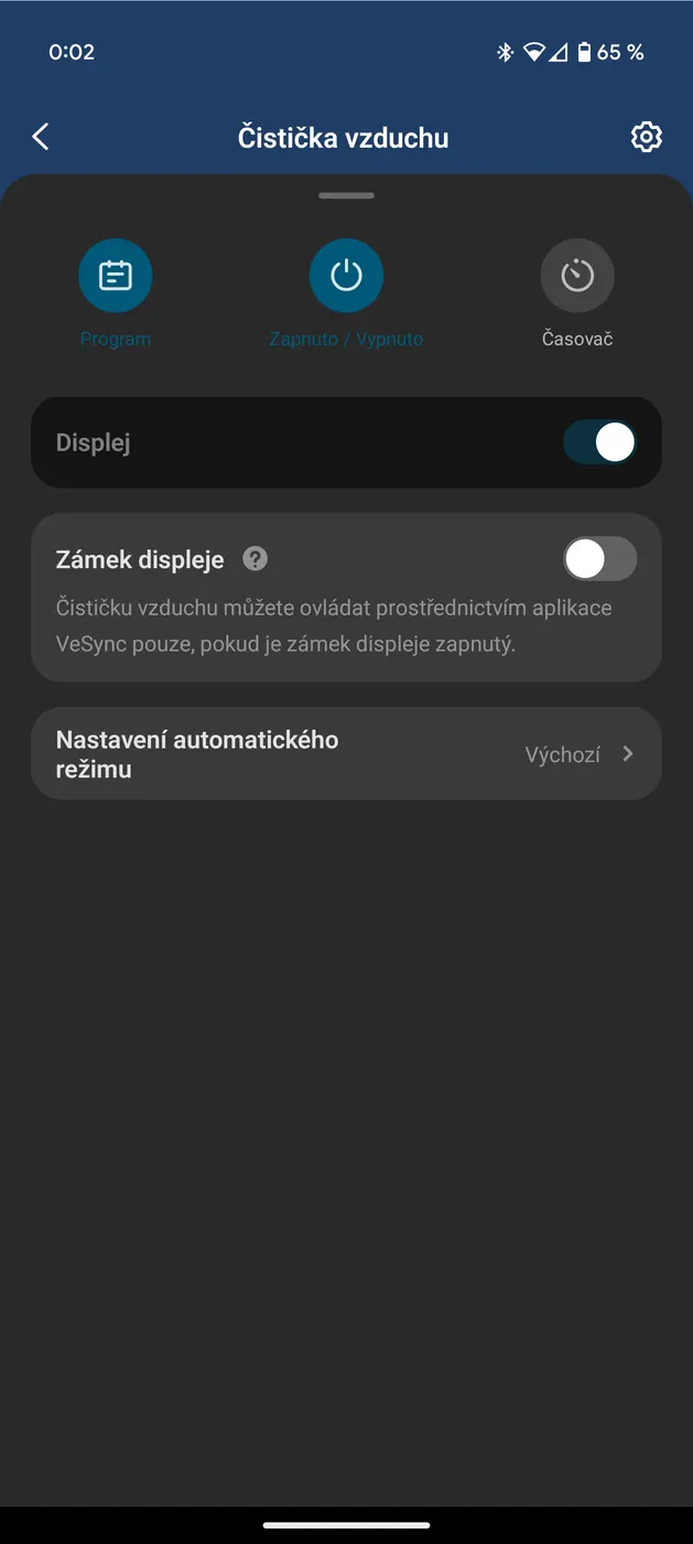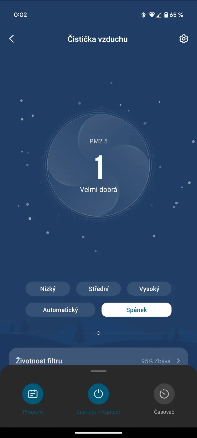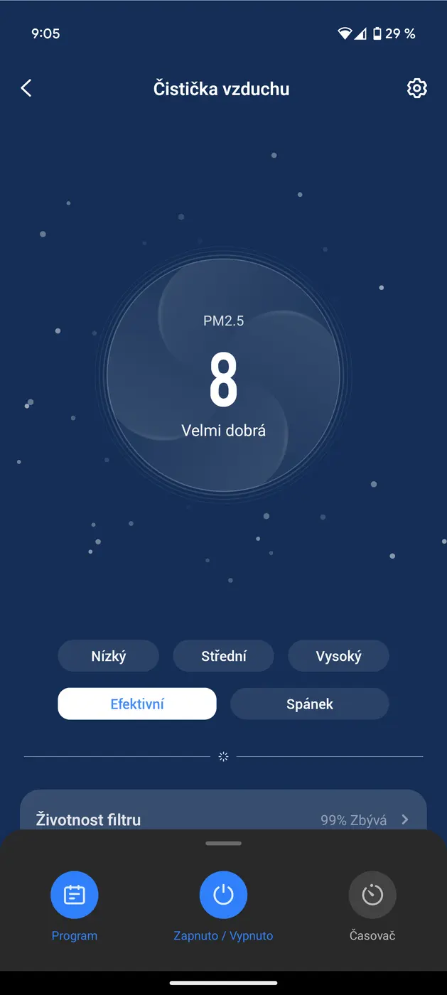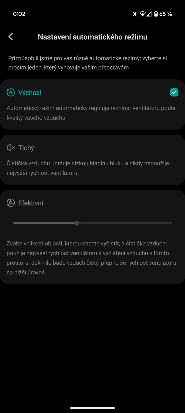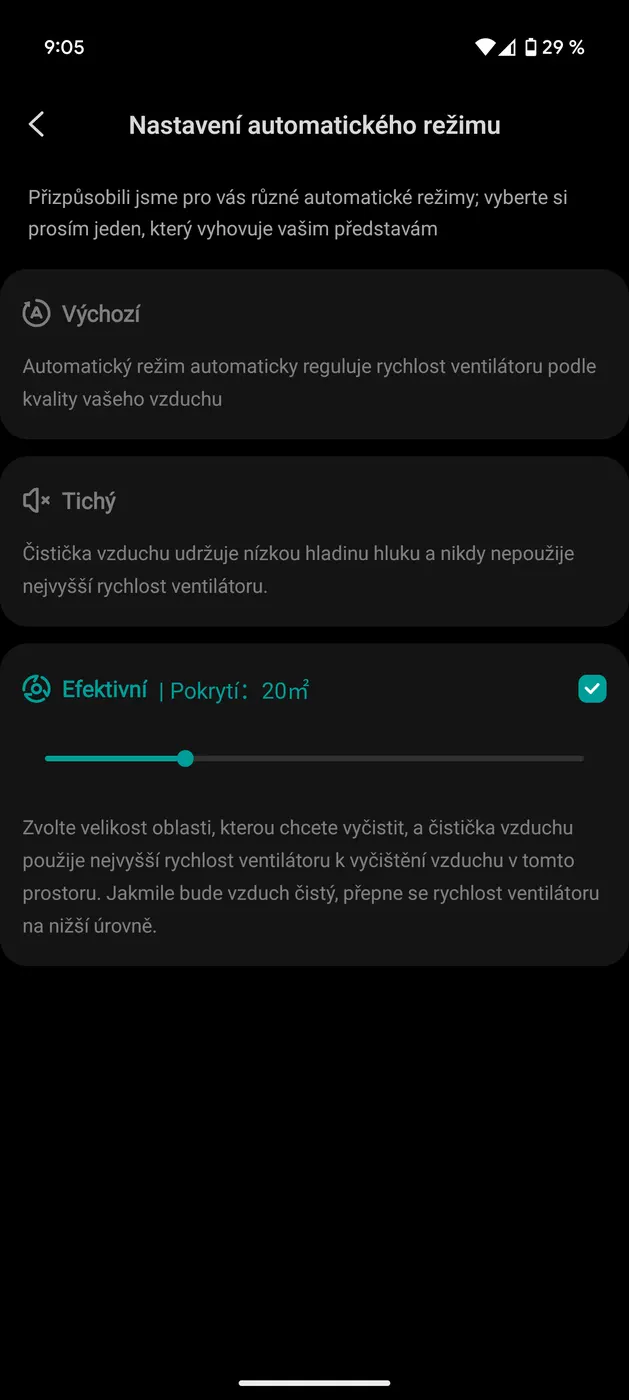 V aplikácii je možné veľmi jednoducho vybrať program, ktorý automaticky upraví výkon čističky na základe požiadaviek používateľov a kvality vzduchu. Zariadenie následne vyberie vhodný režim a ďalšie nastavenia. Aplikácia síce neponúka slovenčinu, ale zo zoznamu jazykov si môžete vybrať napríklad češtinu.