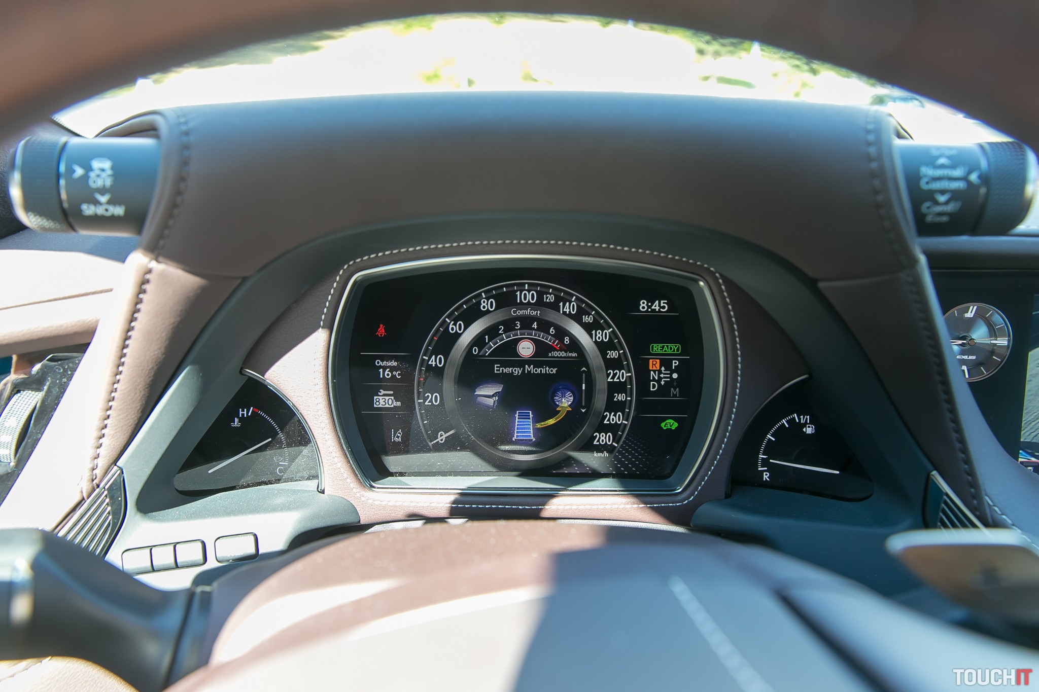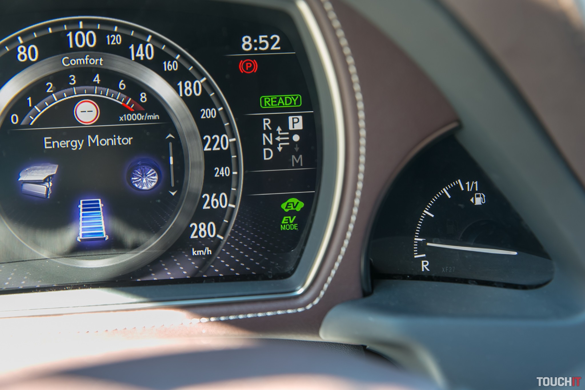 Priamo pred vodičom je združený prístroj, ktorý napr. ukazuje aj to, ako prúdi energia medzi benzínovým a elektrickým motorom ako aj batériou.