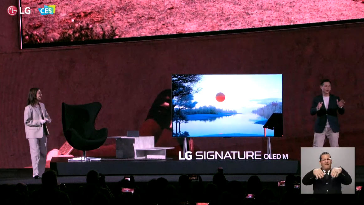LG predstavilo aj svoju vrcholnú novinku – 4K televízor s bezdrôtovým prenosom obrazu a zvuku. Funguje pri 4K rozlíšení 120 Hz a súčasťou televízora je aj USB kľúč, ktorý postačuje na pripojenie externého zariadenia Zero Connect Box. Ide o 97-palcový televízor LG OLED SIGNATURE M.