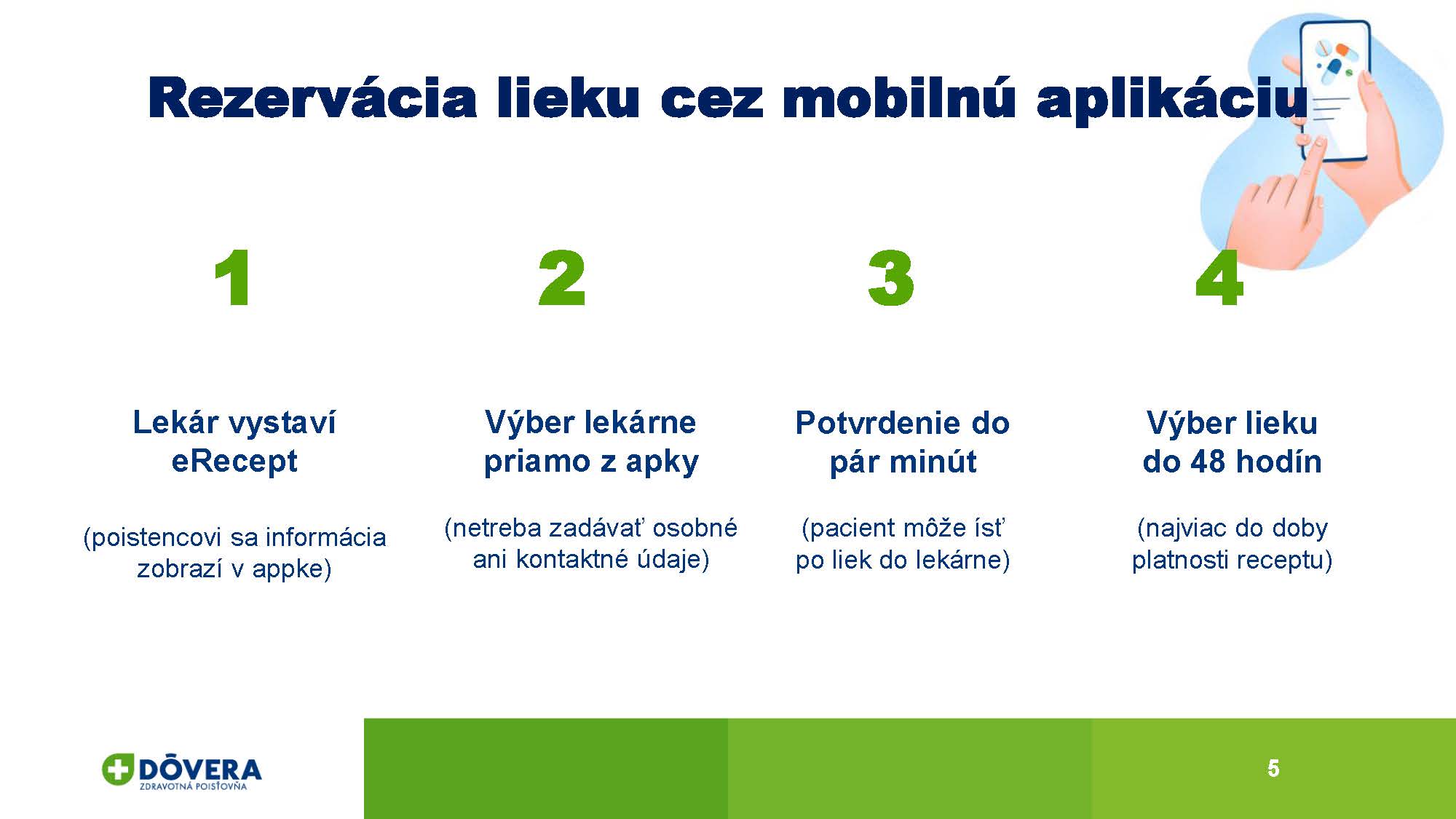 Dôvera je prvou zdravotnou poisťovňou, ktorá zaviedla nielen rezerváciu lieku cez mobilnú aplikáciu, ale aj eRecept, ePomôcky, eKúpele a mnohé ďalšie služby elektronického zdravotníctva.