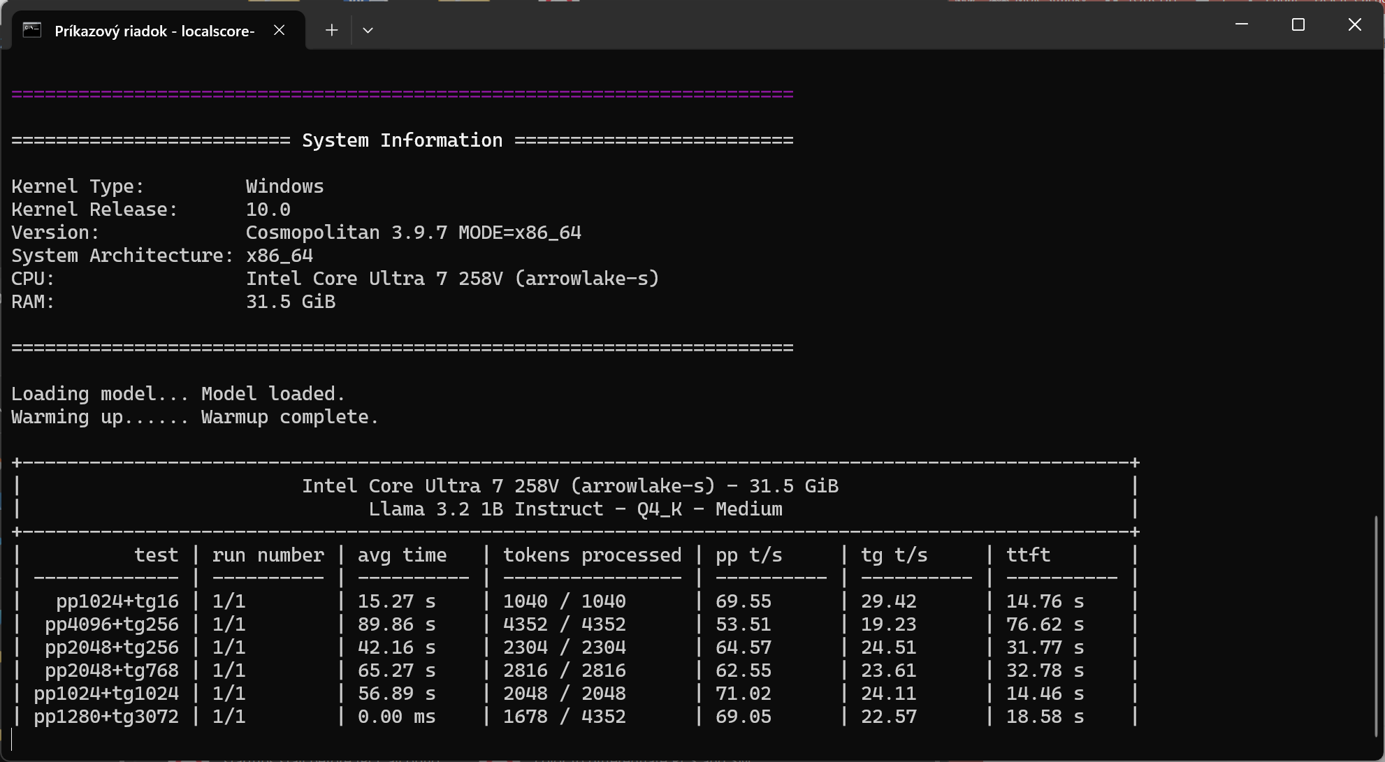 AI sa dá použiť aj s integrovanou grafikou a úlohu spracovania AI na seba preberie procesor. Všetky tieto údaje sú vidieť na webe projektu. Podstatné ale je, že rovnaký test sa dá spustiť aj na vašom počítači. Netreba nič zložito konfigurovať. Stiahnete si aplikáciu LocalScore a vybraný jazykový model v upravenom formáte gguf. Použiť môžete aj vlastný a podľa návodu na tejto stránke k nemu dopíšete v príkazovom riadku cestu.